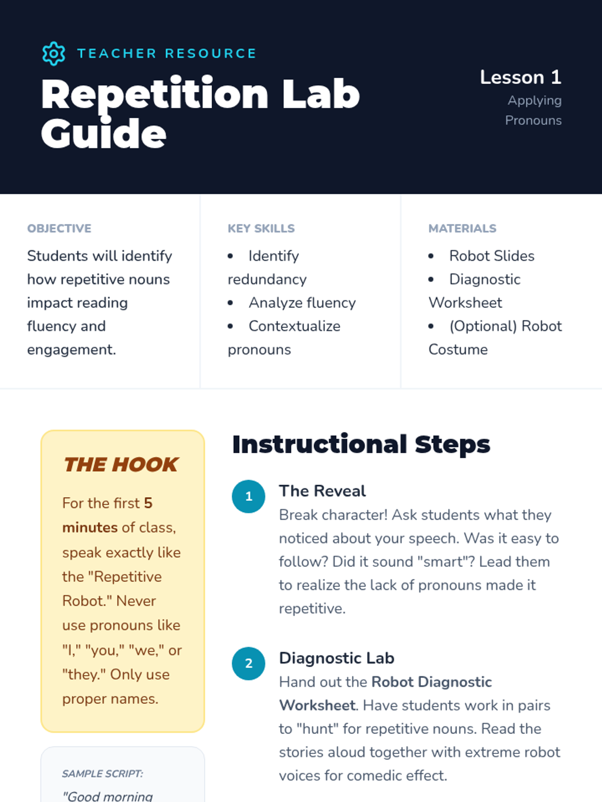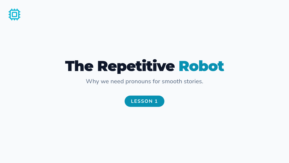 A 3rd-grade grammar project focusing on the stylistic power of pronouns. Students analyze clunky, repetitive 'robot' speech and transform it into smooth, professional narrative writing while mastering pronoun-antecedent agreement.