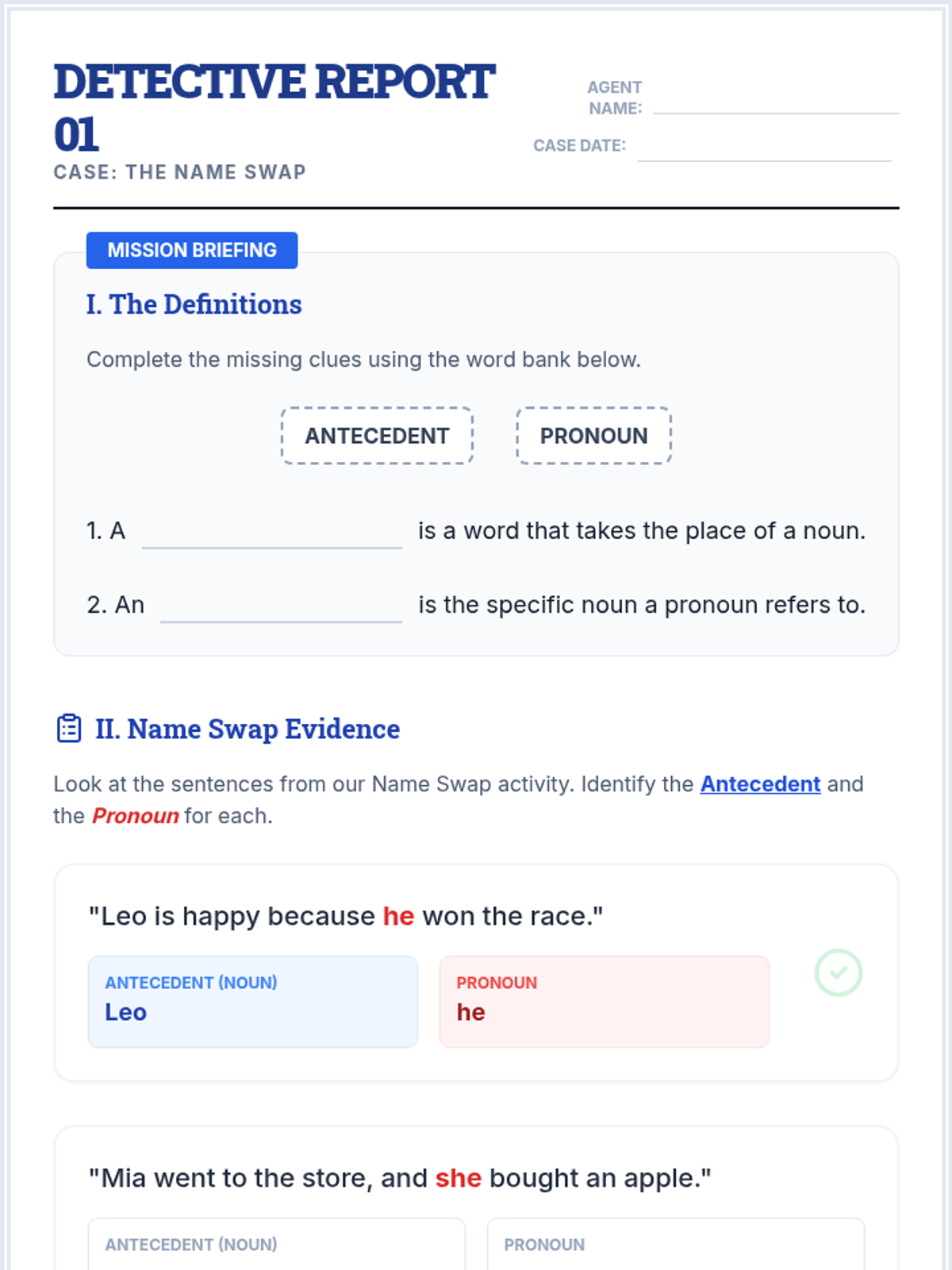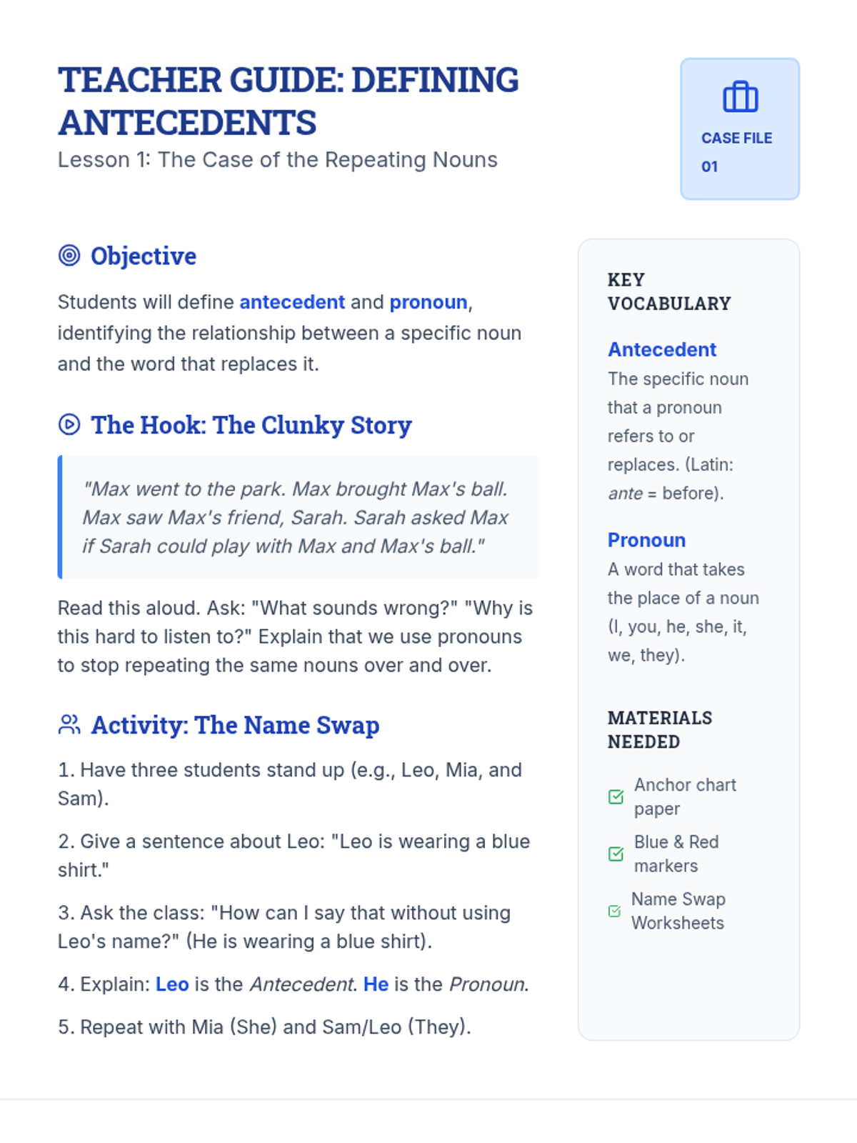 A comprehensive introduction to pronouns and antecedents for 3rd graders, following a 'Pronoun Detective' theme. Students progress from defining terms to identifying connections within and across sentences, concluding with clear sentence construction.