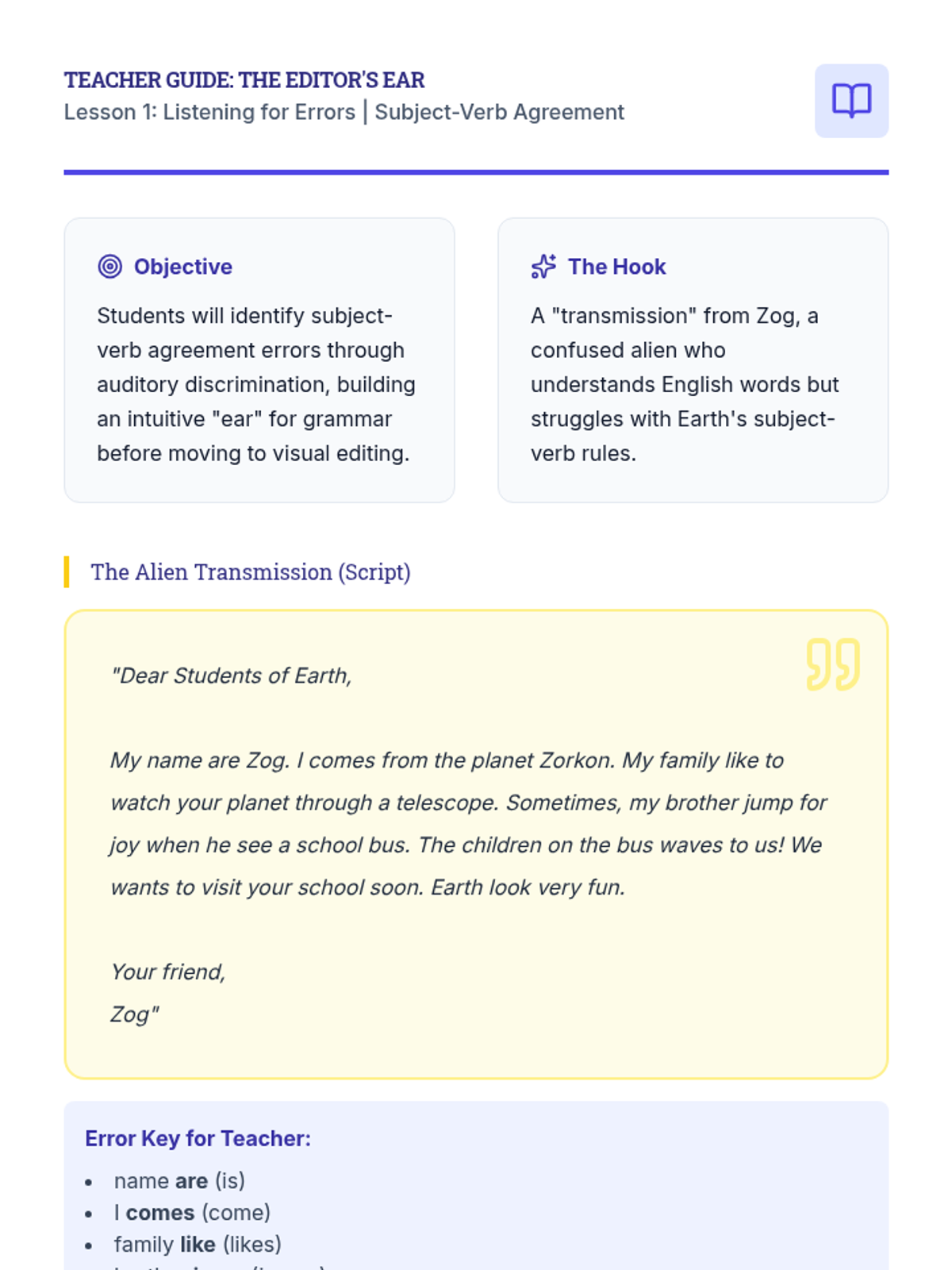 This 5-lesson sequence guides 3rd-grade students through the process of identifying and correcting subject-verb agreement errors. Moving from auditory discrimination to specific proofreading strategies and finally to authentic revision of their own work, students build the skills needed to ensure clarity in their writing.
