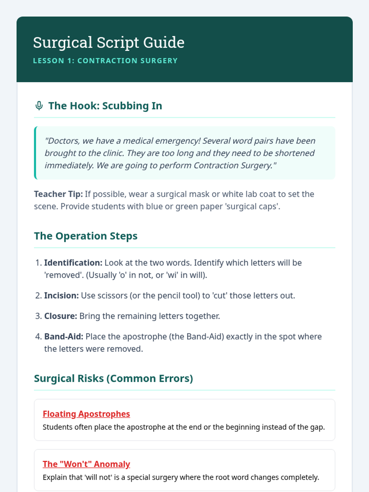 A comprehensive 5-lesson sequence where students act as "word surgeons" and "grammar detectives" to master the distinct roles of the apostrophe in possessive nouns and contractions.