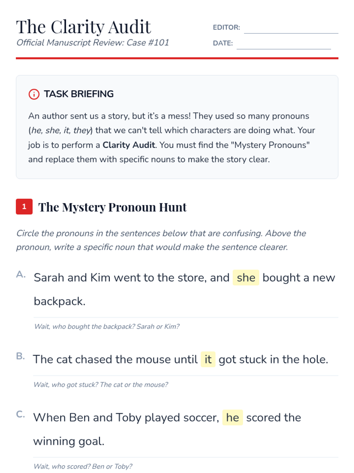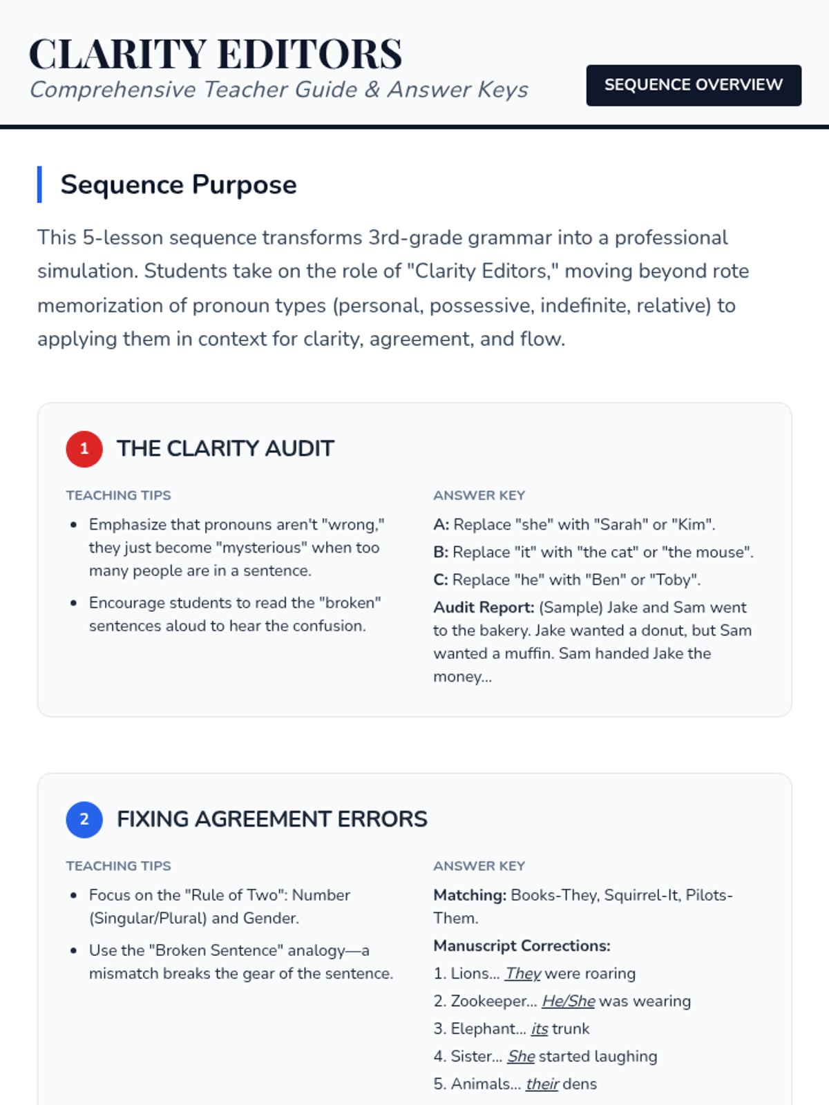 A 5-lesson unit where 3rd-grade students become professional editors, mastering pronoun clarity, agreement, and consistency through real-world simulation and skill-building activities.