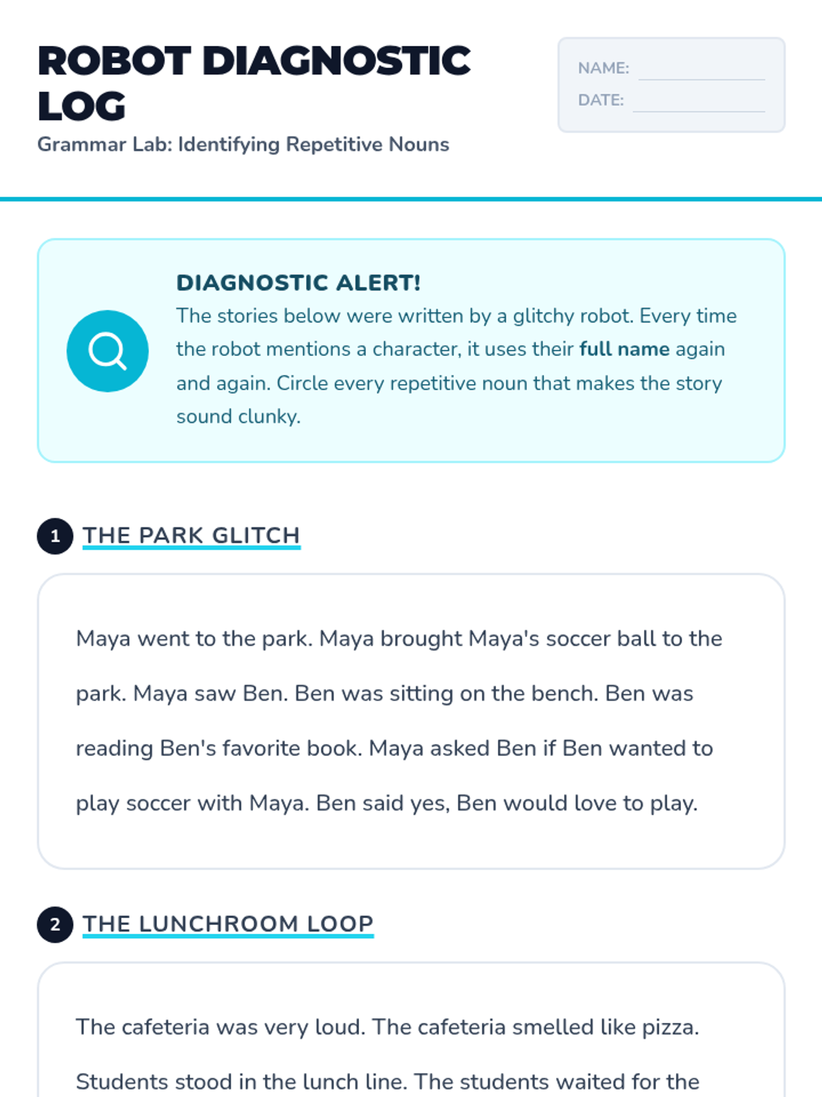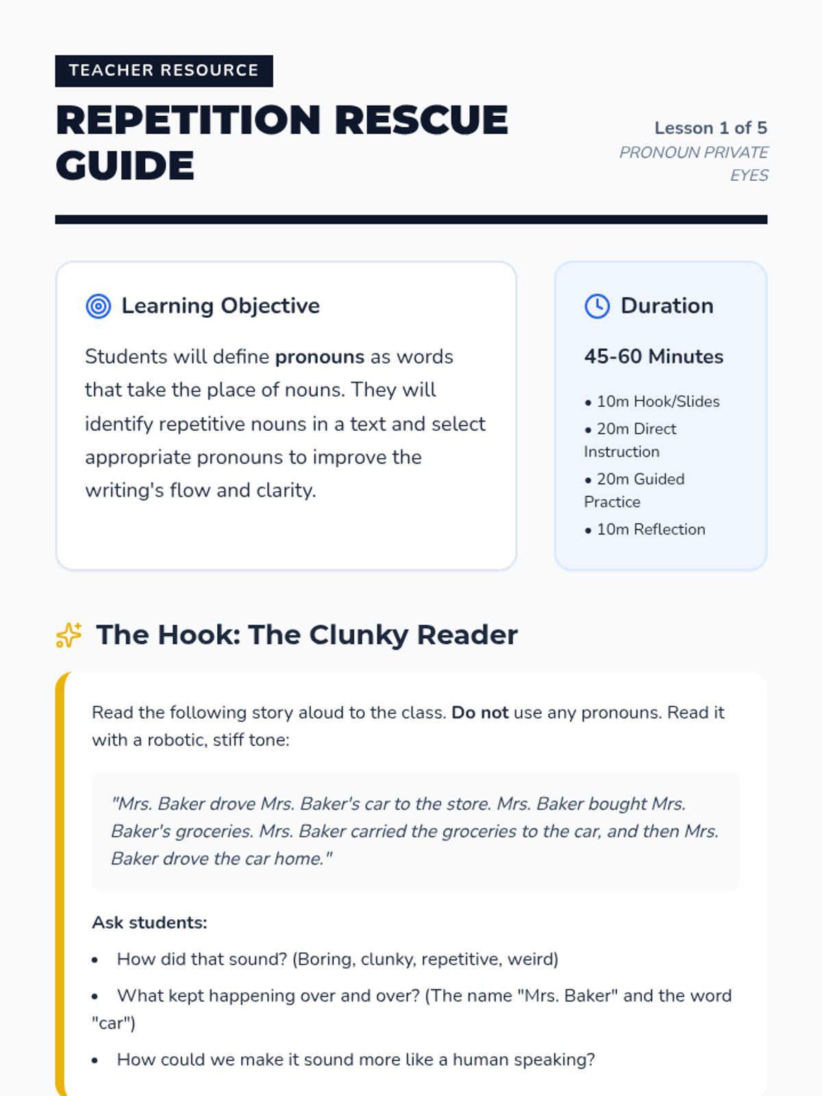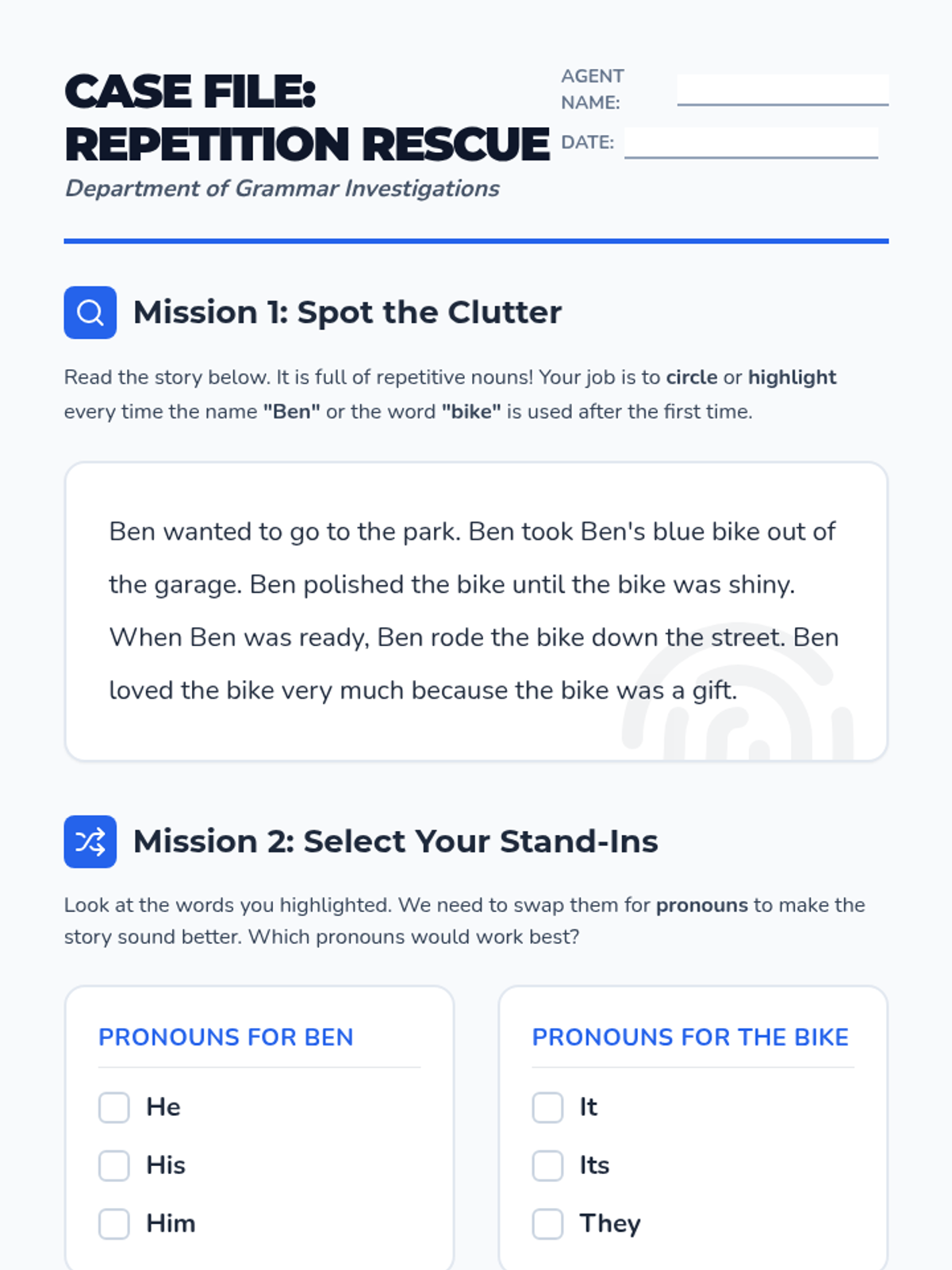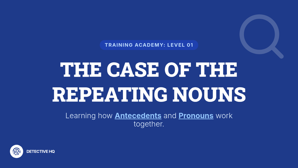 A comprehensive 3rd Grade grammar sequence focusing on pronoun-antecedent agreement. Students become 'Pronoun Private Eyes' to solve the mystery of repetitive writing, learning how pronouns act as essential substitutes for nouns to improve flow and clarity.