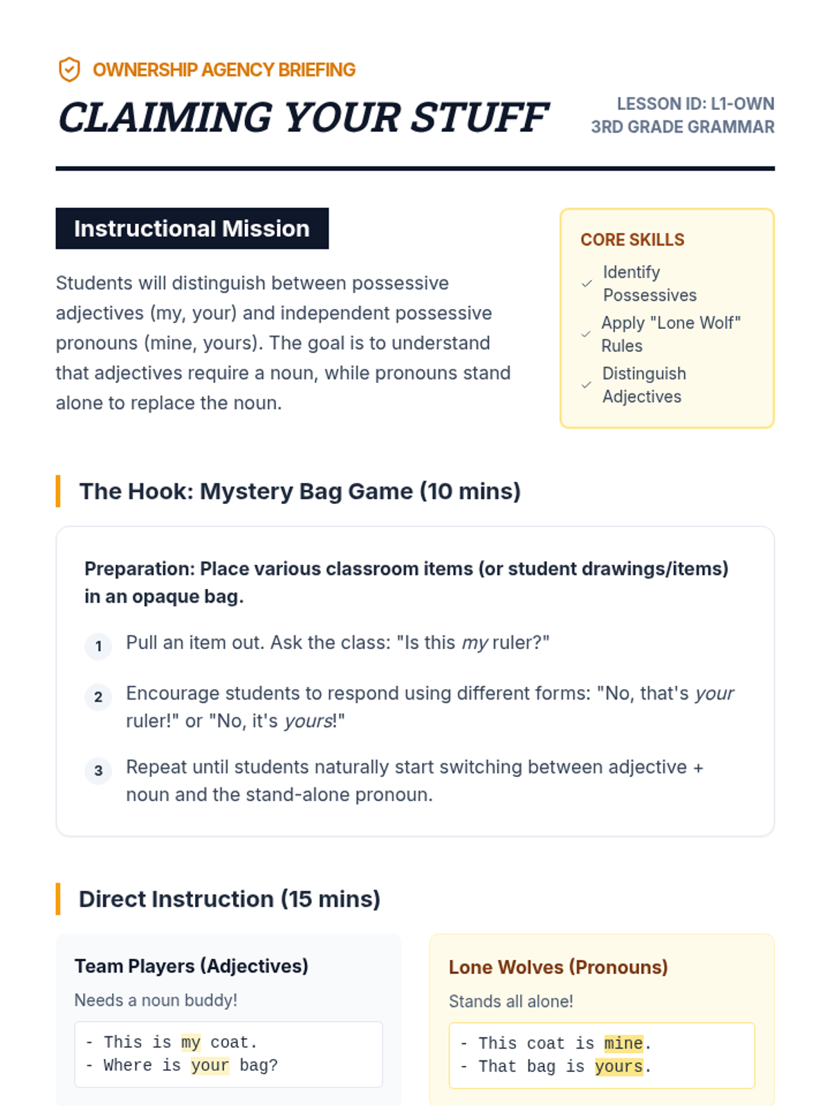 A comprehensive 3rd-grade grammar sequence exploring possessive pronouns and adjectives. Students learn to show ownership, distinguish possessives from contractions, and apply their knowledge in a creative 'Lost and Found' catalog project.