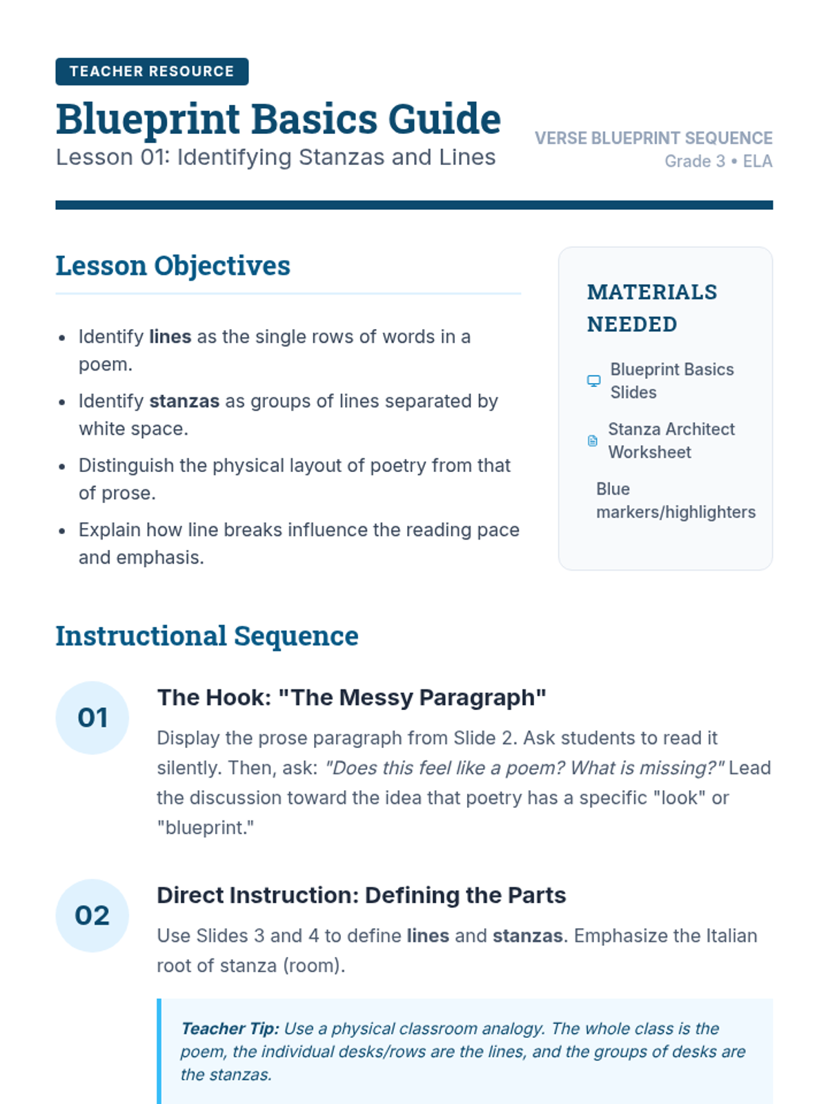 This 3rd-grade sequence explores how imagery, rhythm, and sound devices create meaning in poetry through a multisensory read-along approach. Students progress from visualizing sensory details to analyzing structural elements and finally synthesizing their understanding by creating their own audio-enhanced poetry experiences.
