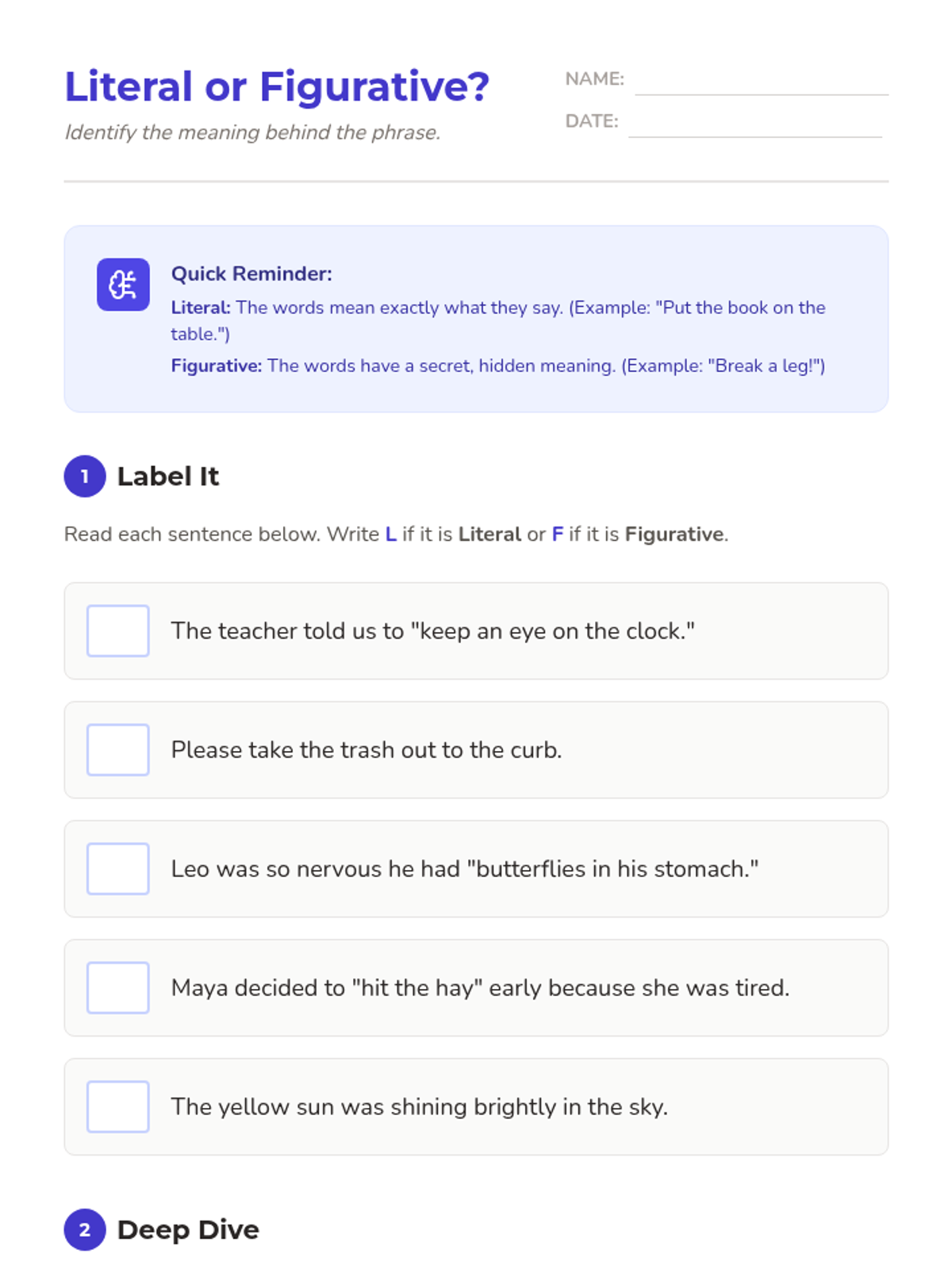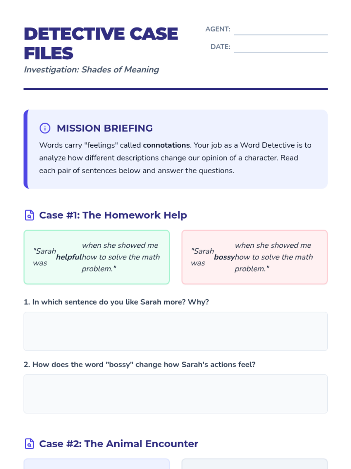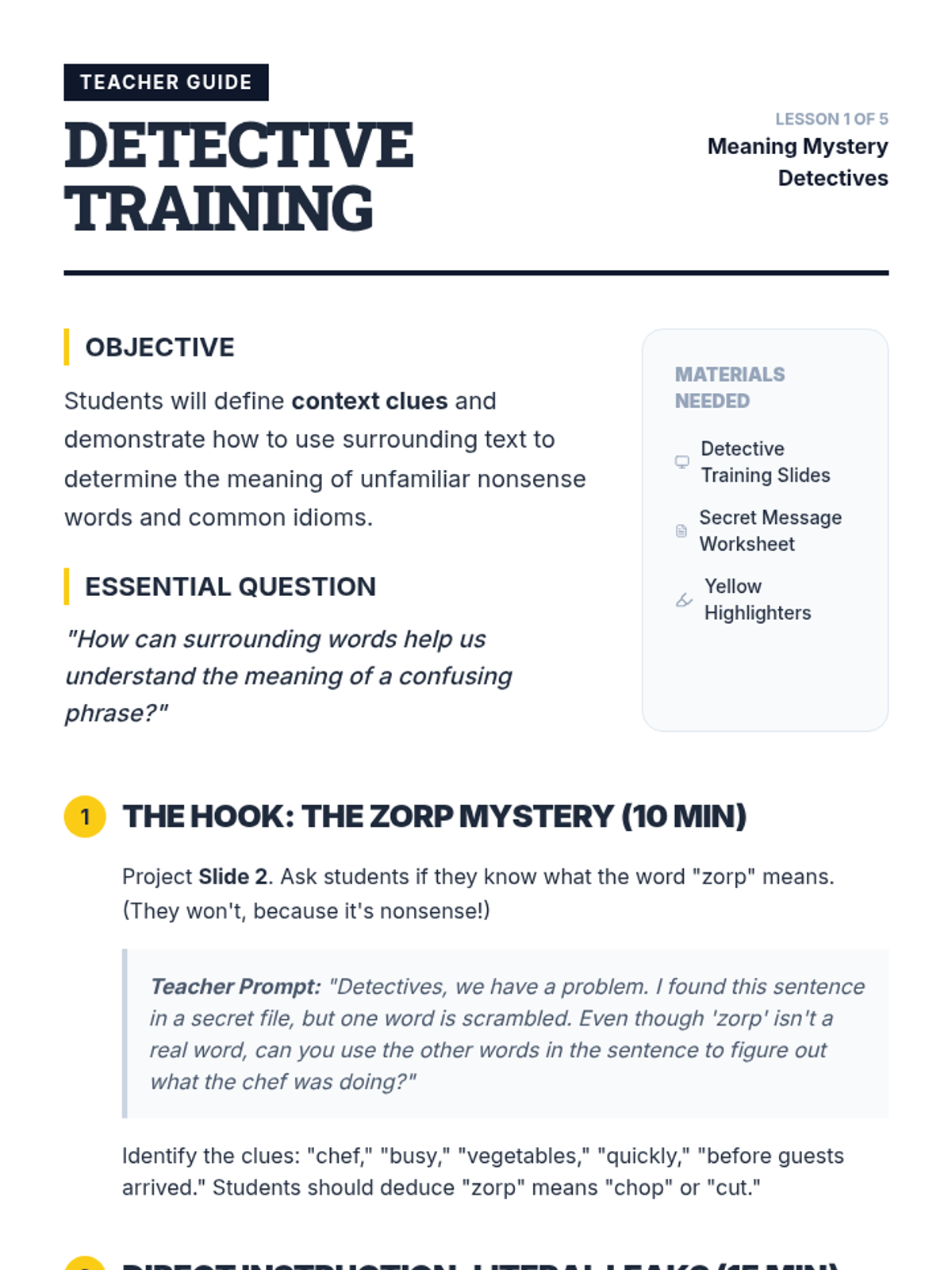 A 3rd-grade sequence focused on using context clues to interpret idioms in social and written contexts. Students act as detectives to solve the mystery of figurative language through scenario analysis, error correction, and creative writing.