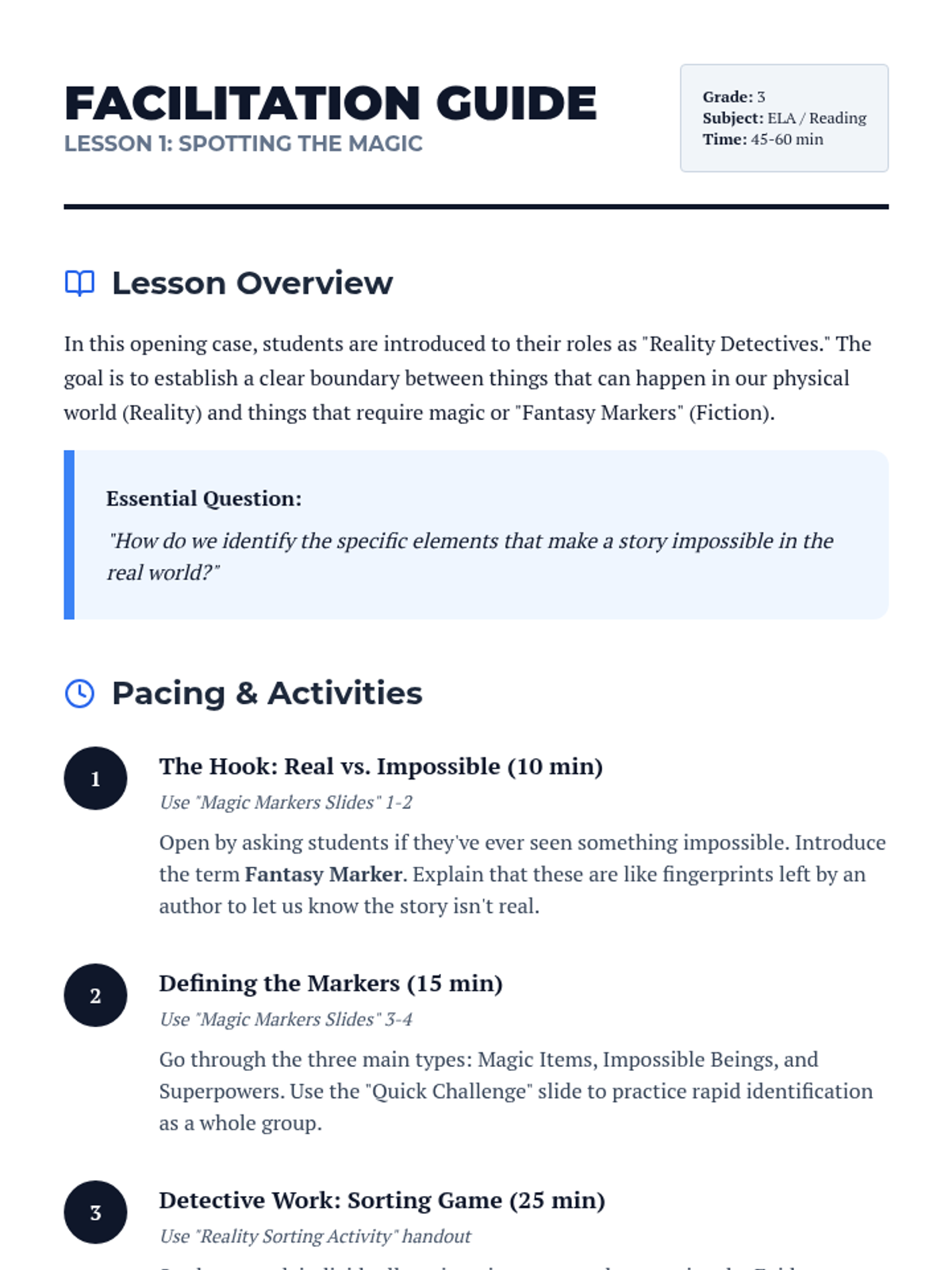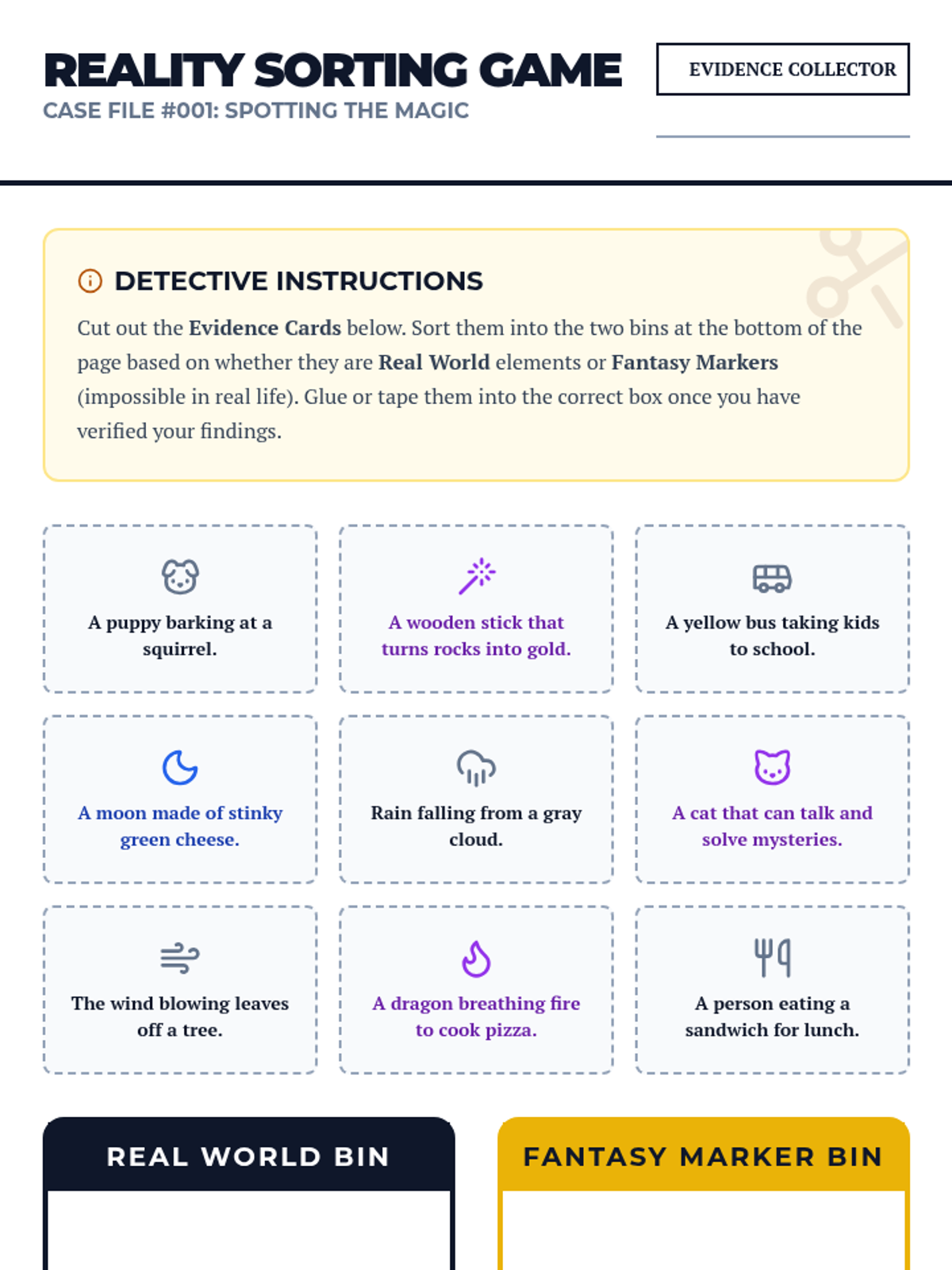 A 5-lesson sequence where 3rd-grade students learn to distinguish reality from fiction by identifying fantasy markers, personification, and exaggeration. Students act as 'Reality Detectives' to uncover the rules that separate the real world from the impossible.