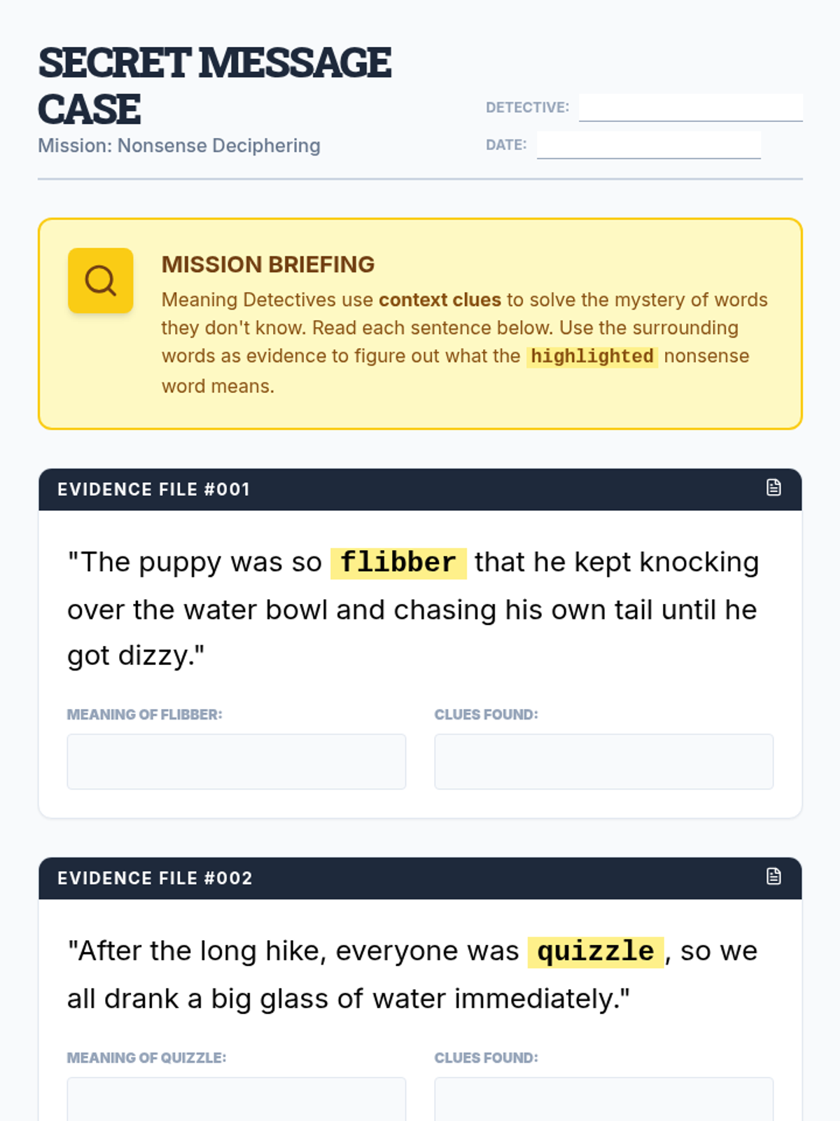 A 4-day small group intervention focused on using context clues (definition, example, synonym, and antonym) supported by visual illustrations to determine the meaning of unknown words. Students act as 'Word Detectives' to solve vocabulary mysteries.