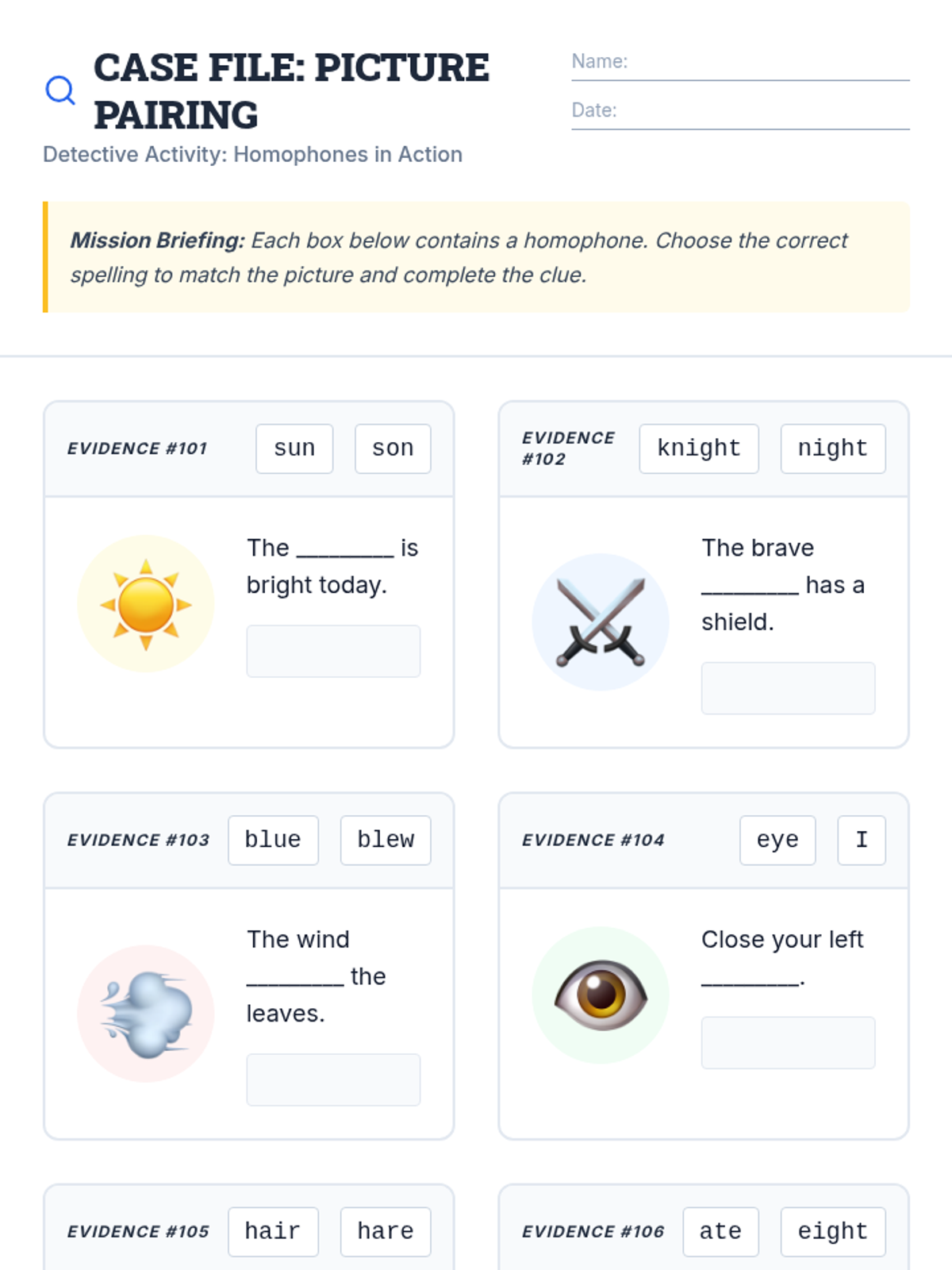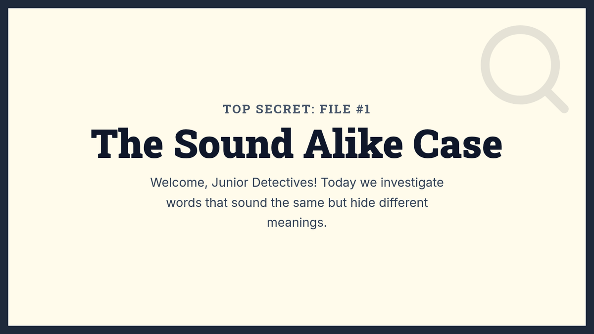 A comprehensive 3rd-grade sequence focused on mastering homophones through detective-themed investigation, contextual analysis, and proofreading practice. Students progress from simple pairs to high-frequency triplets, culminating in a creative writing project.