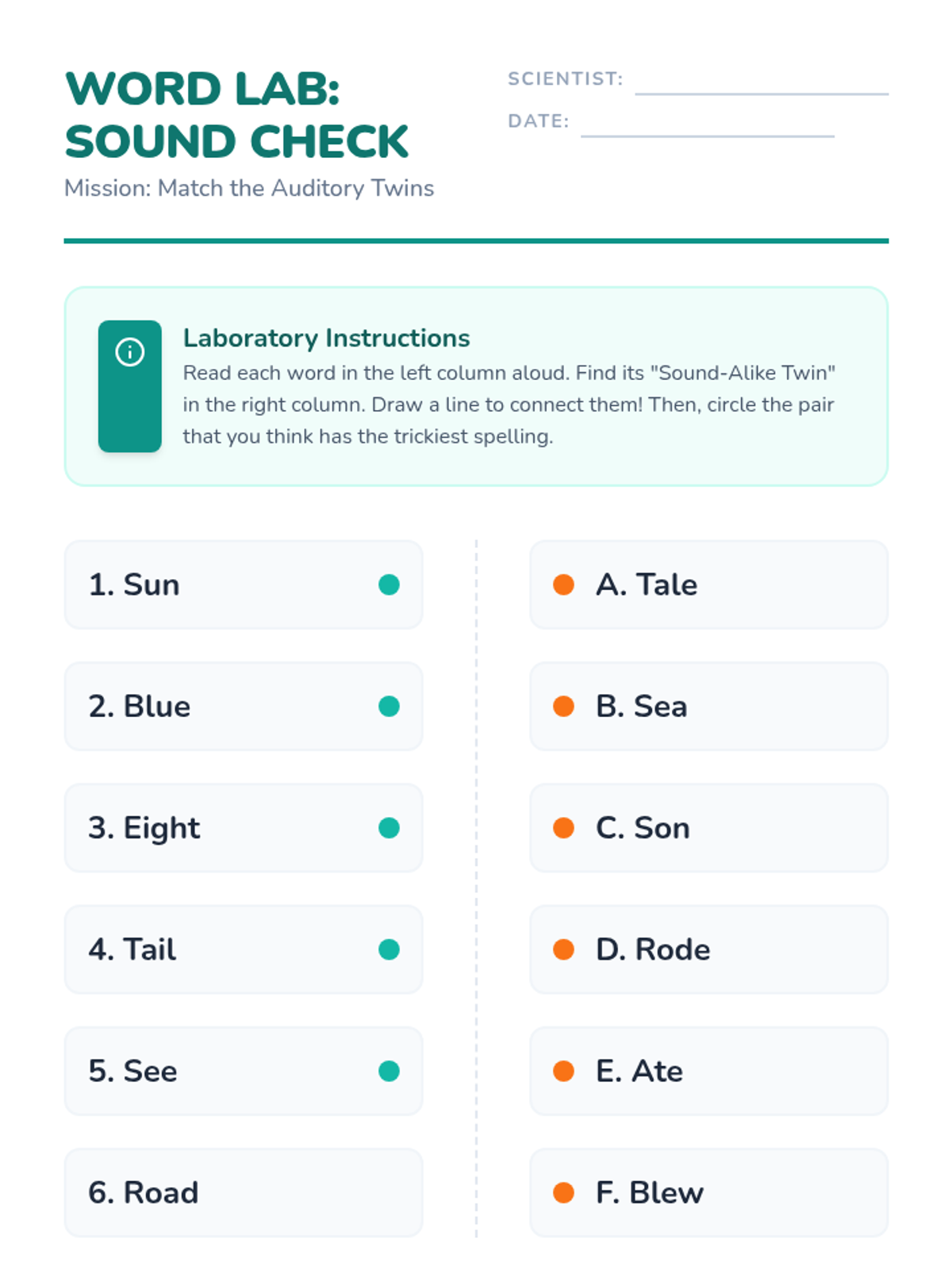 A comprehensive 3rd-grade sequence on homophones, exploring auditory recognition, visual mapping, spelling patterns, and contextual application. Students move from hearing 'sound-alikes' to mastering the visual and orthographic differences between common pairs like see/sea and knight/night.