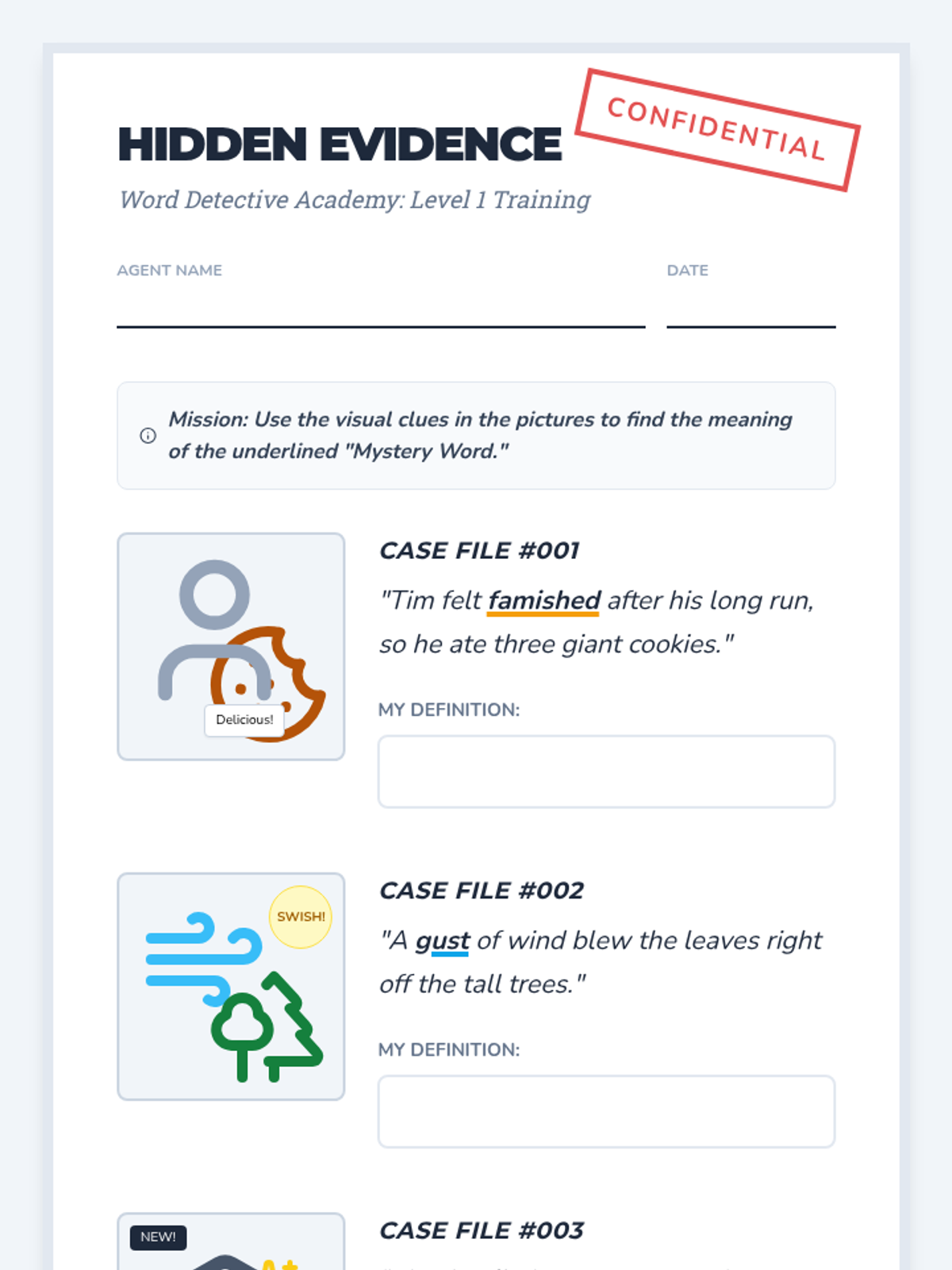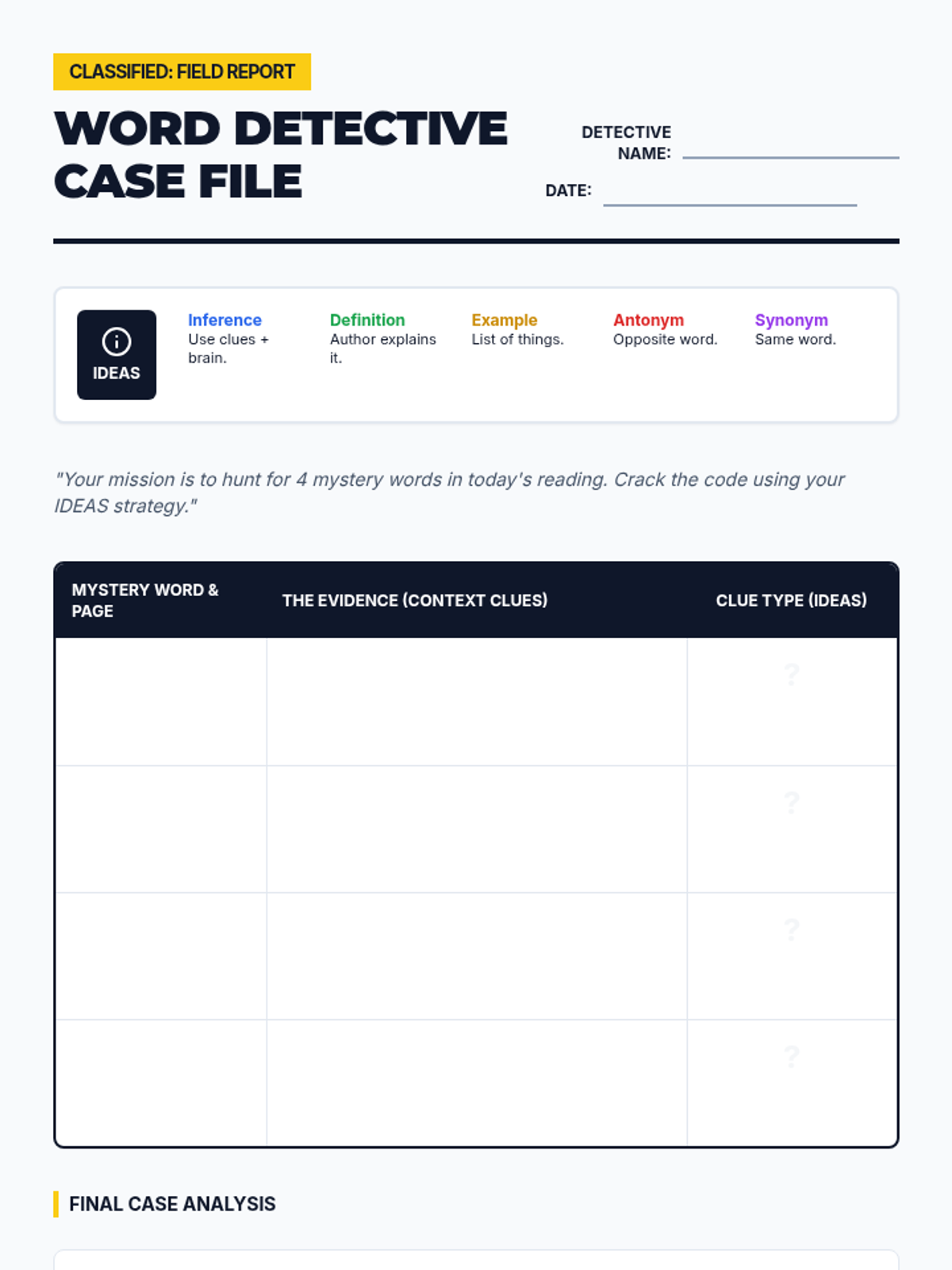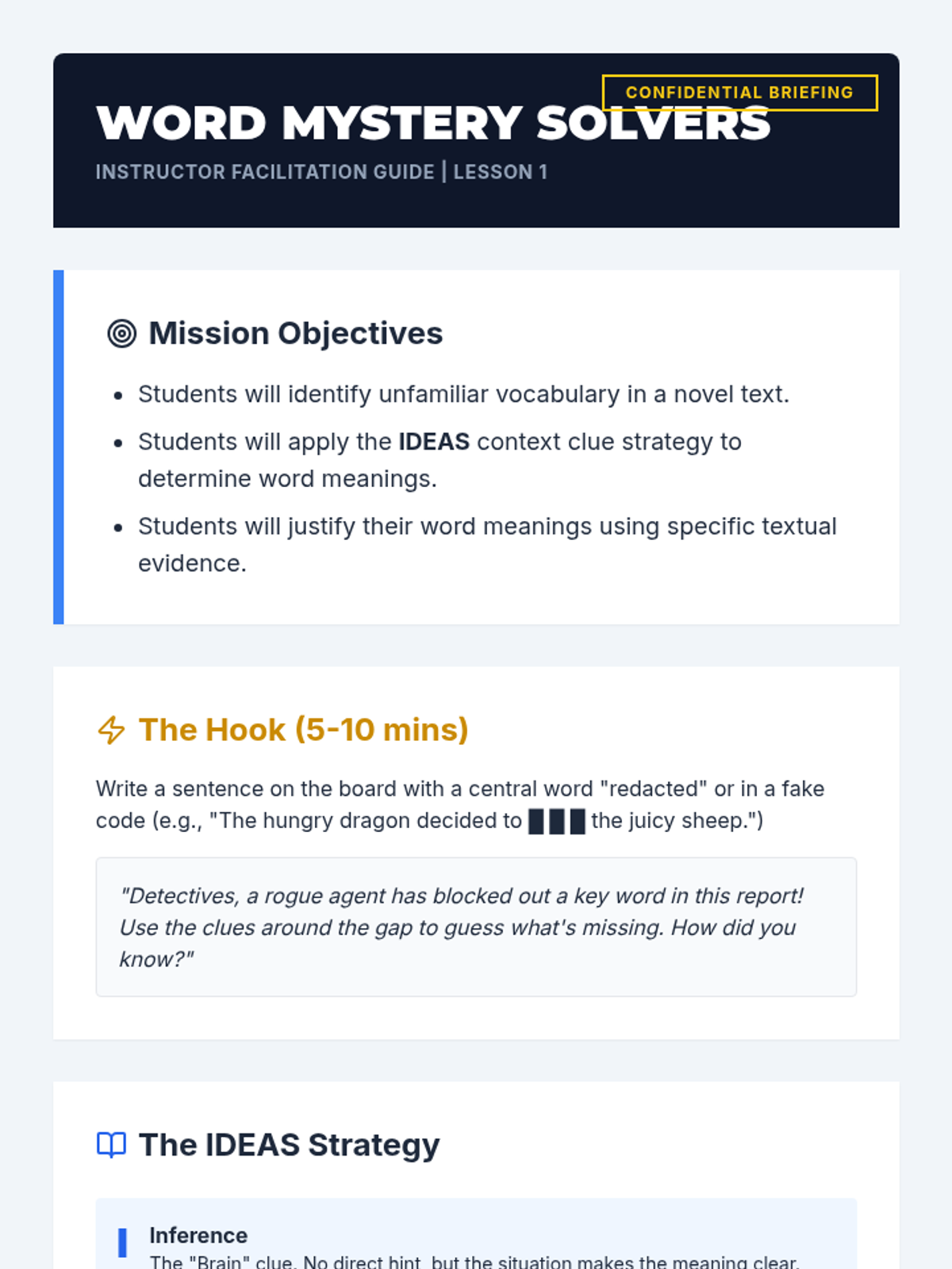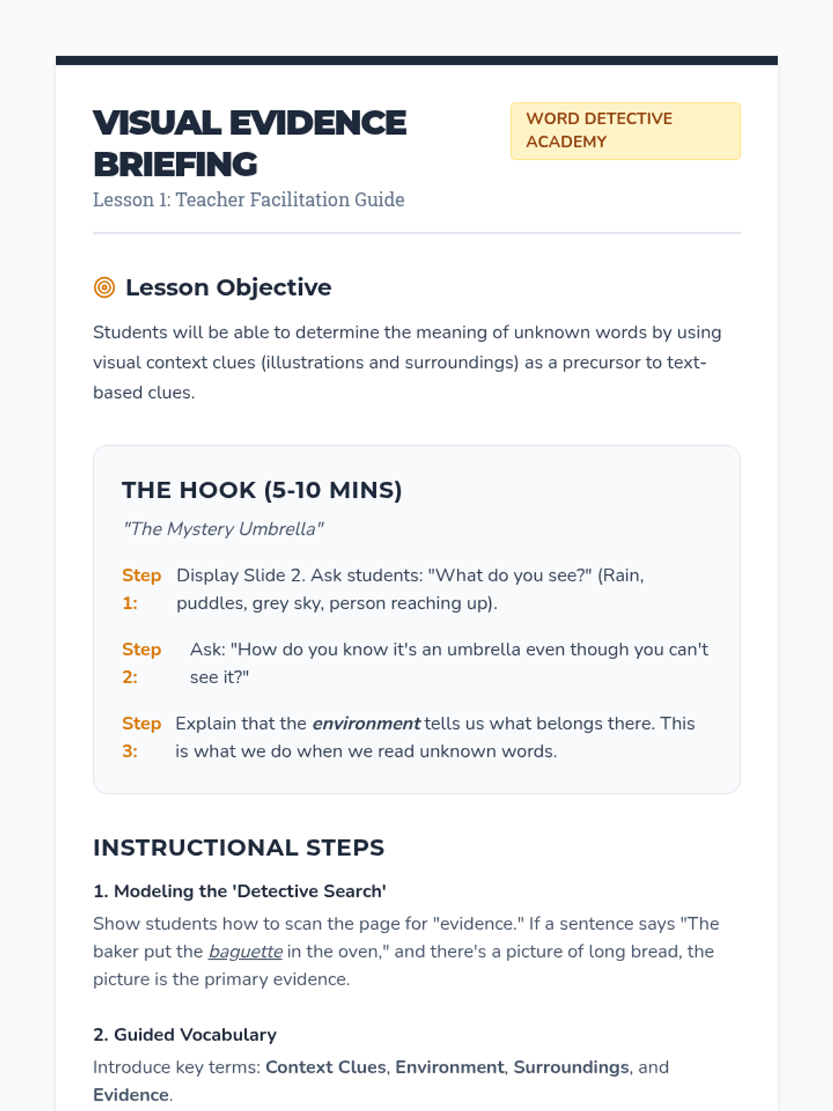A comprehensive 3rd-grade English Language Learning sequence that uses a 'Word Detective' theme to teach students how to determine word meanings through context clues, including visual, synonym, antonym, definition, and example clues.