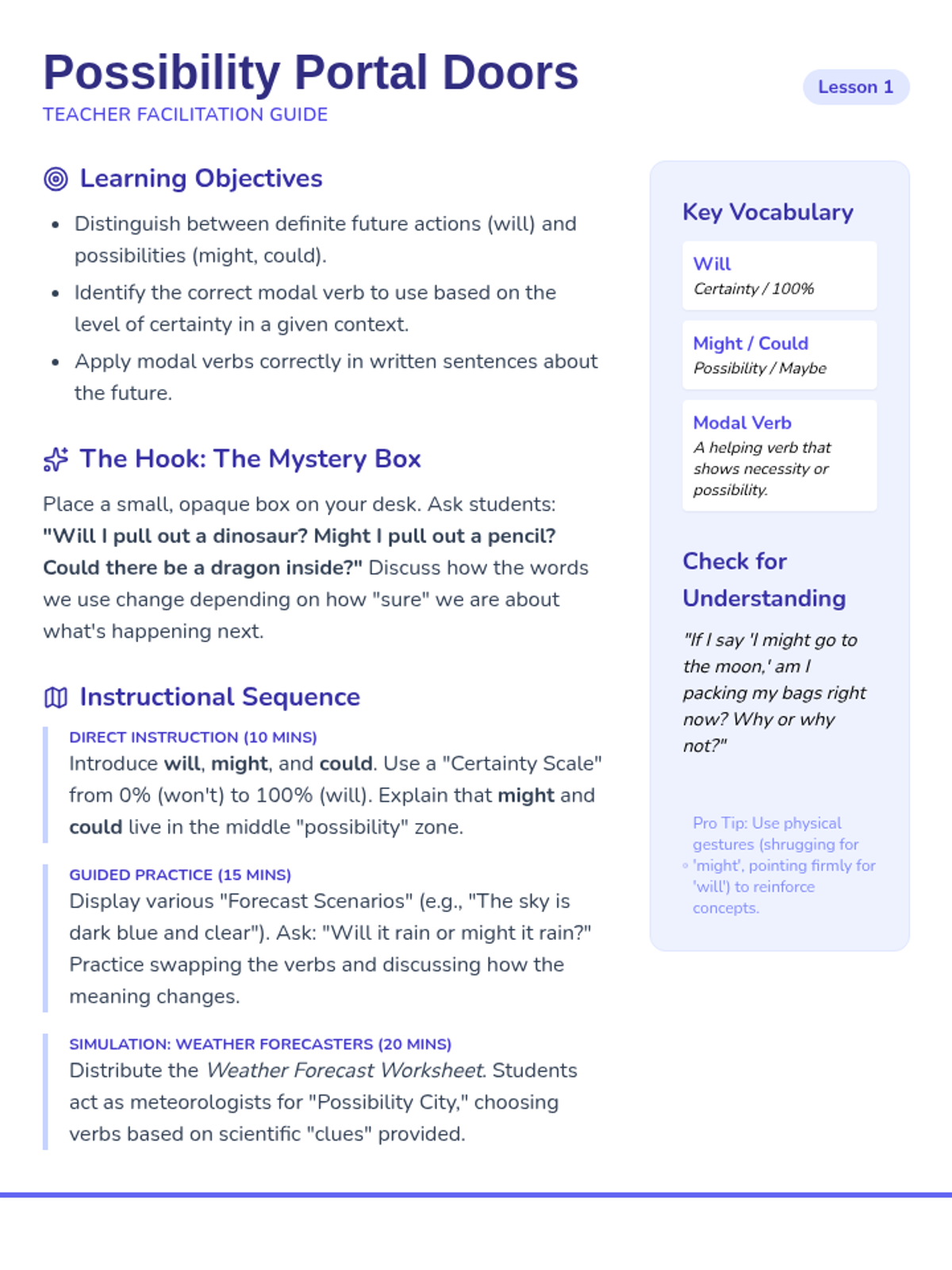 A 5-lesson ESL sequence for 3rd graders to master modal verbs of deduction (must, might, can't) through a fun detective-themed inquiry process. Students move from understanding degrees of certainty to solving a full-scale classroom mystery using logical reasoning.
