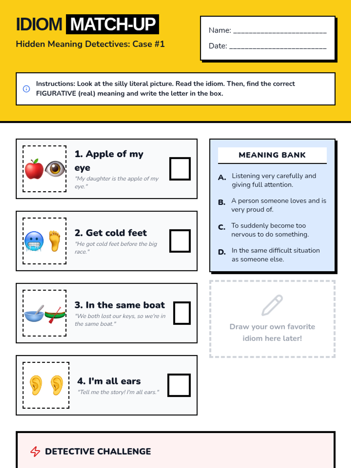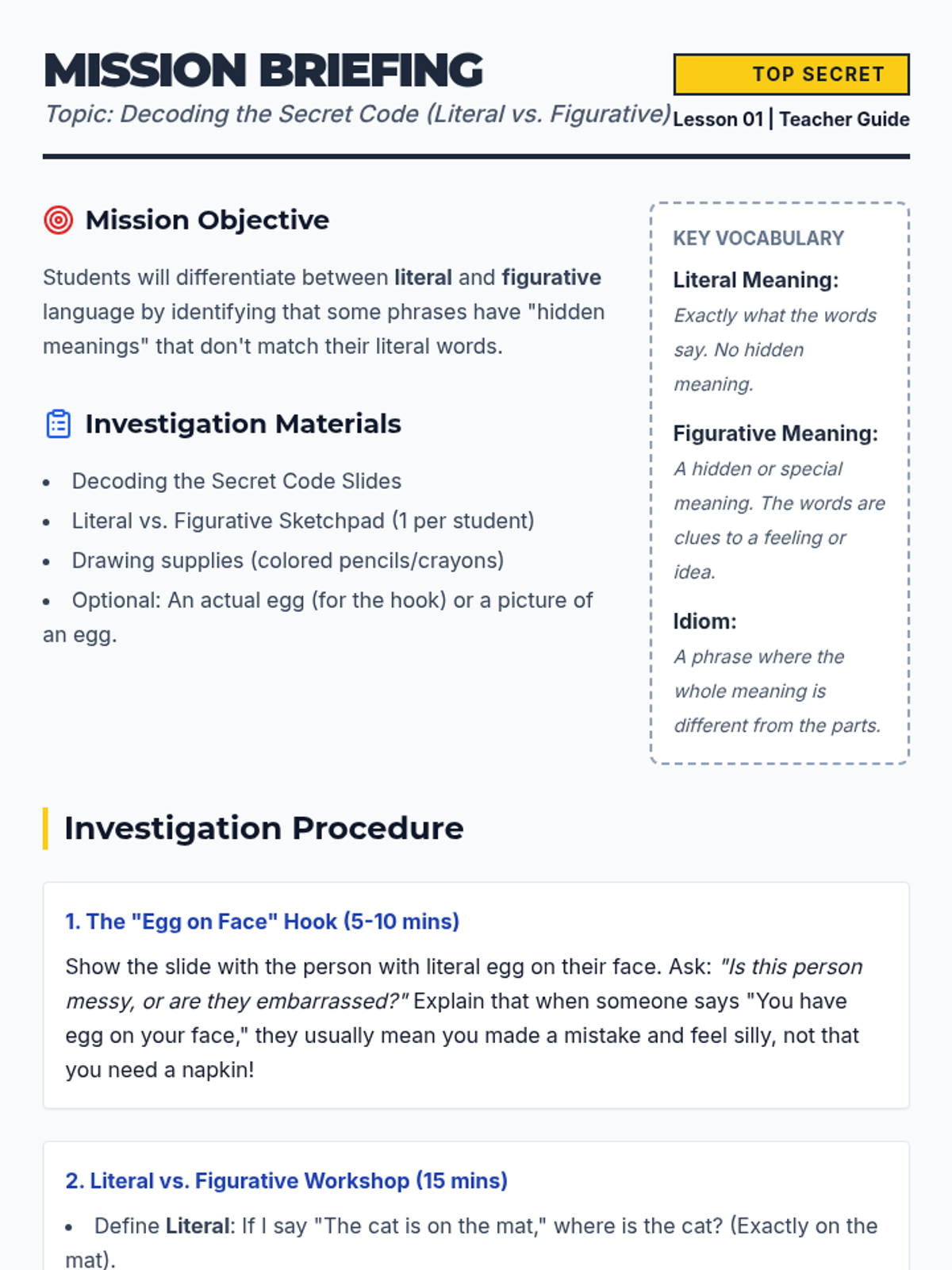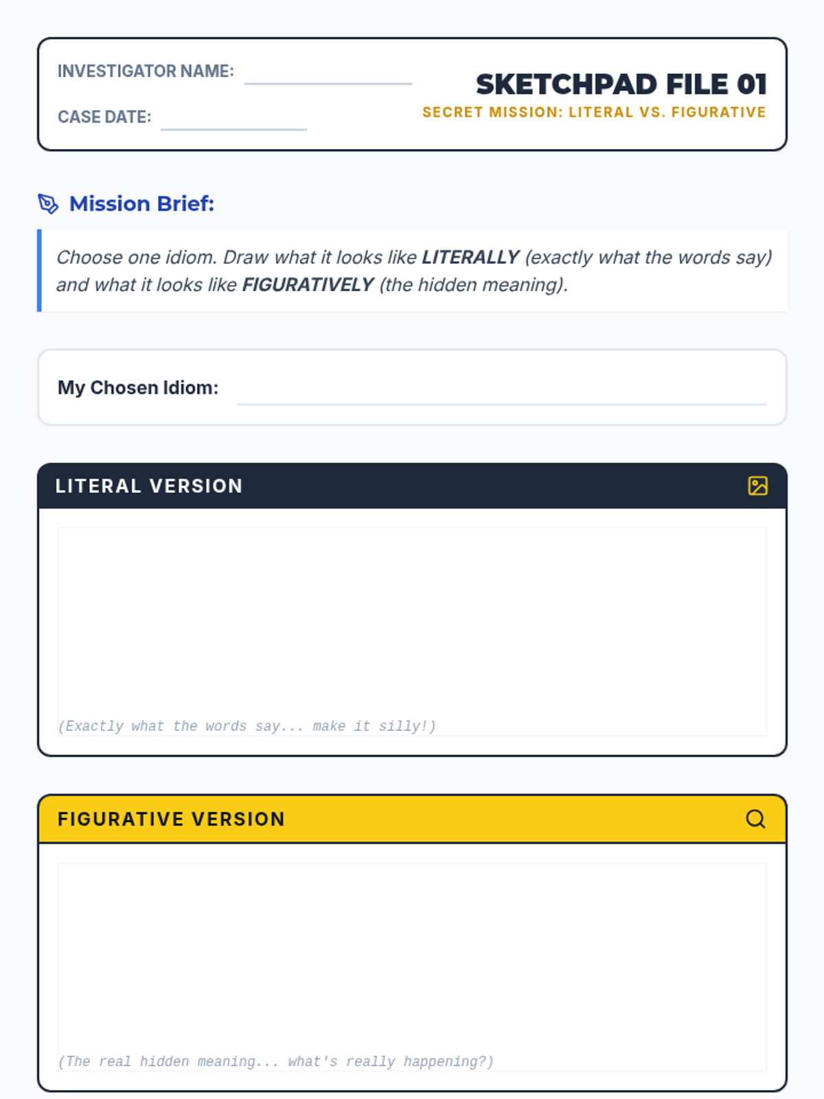 This sequence introduces 3rd-grade students to idioms and figurative language, focusing on the distinction between literal and figurative meanings to improve social communication and vocabulary. Students will use a detective-themed 'Idiom Investigator' framework to decode body-part and animal-based idioms through visualization, matching, and creative expression.