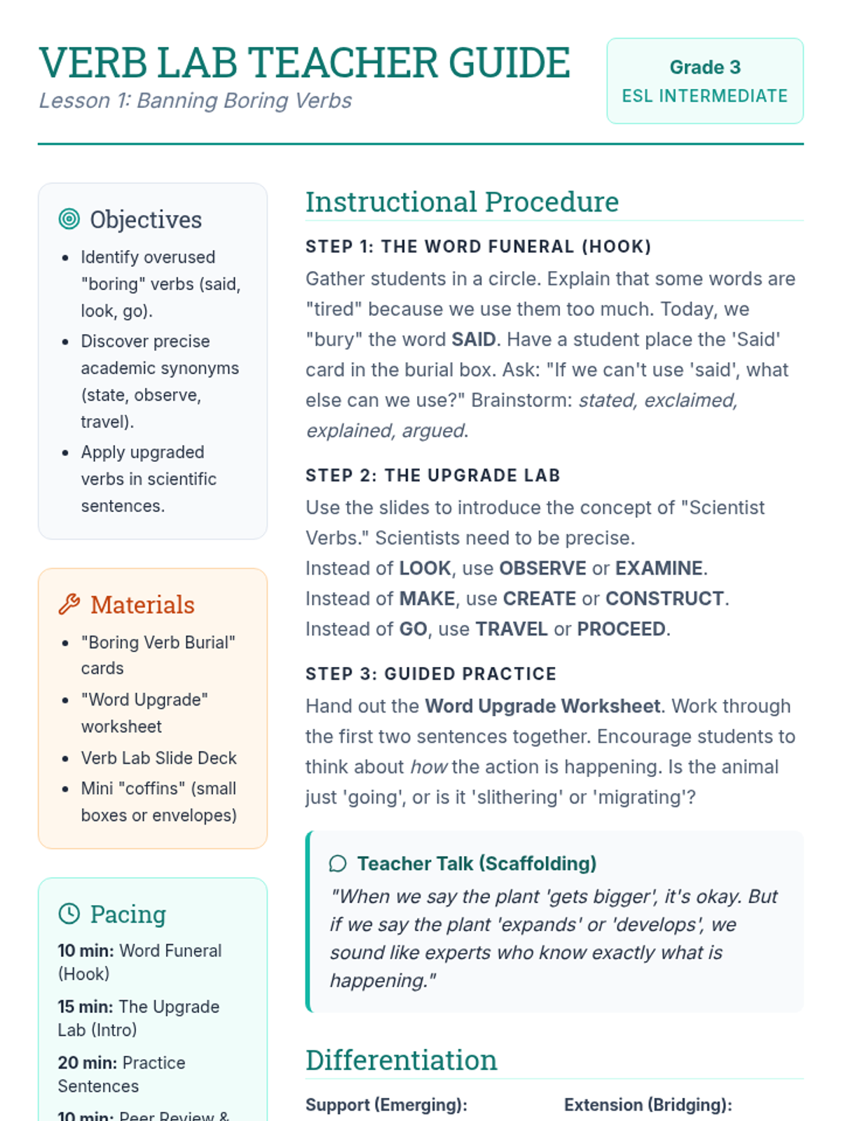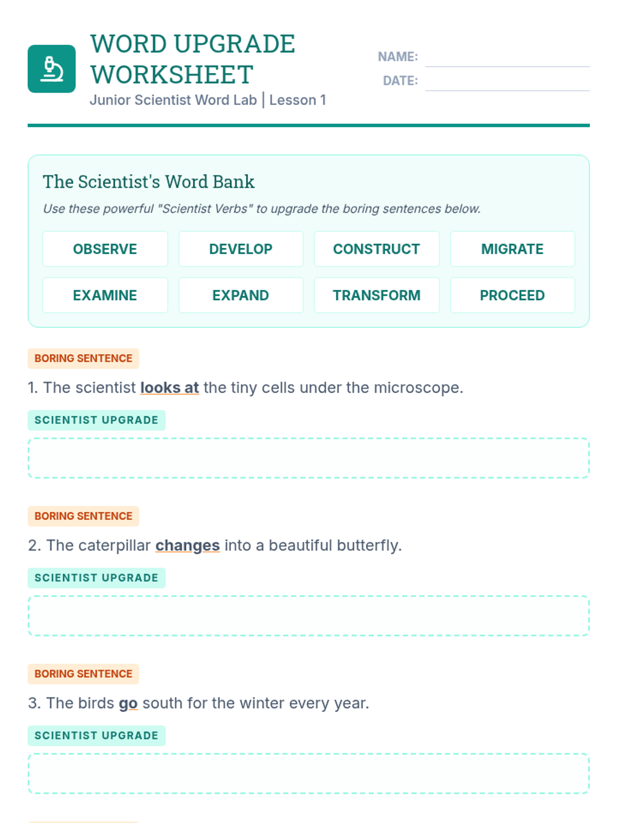 A 5-lesson sequence for 3rd Grade ESL students focusing on transitioning from basic social English to precise academic vocabulary and collocations used in science contexts. Students adopt the role of 'Junior Scientists' to learn verbs, adjectives, and transitions that enhance their descriptive and reporting skills.