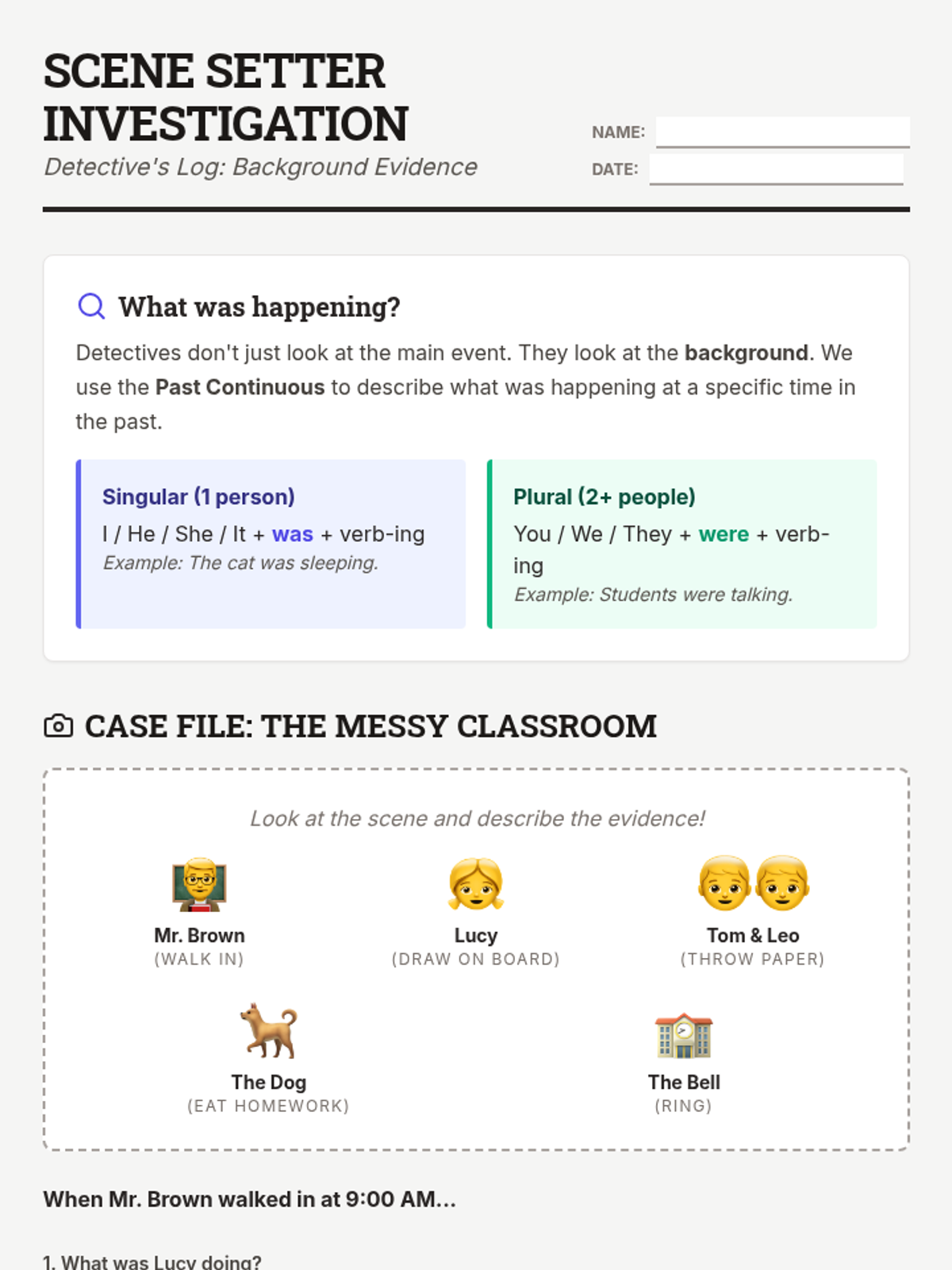 A narrative-focused sequence for 3rd Grade ESL students to master past continuous and simple past tenses through the lens of a detective investigating scenes and stories. Students move from describing background actions to narrating complex, interrupted events.