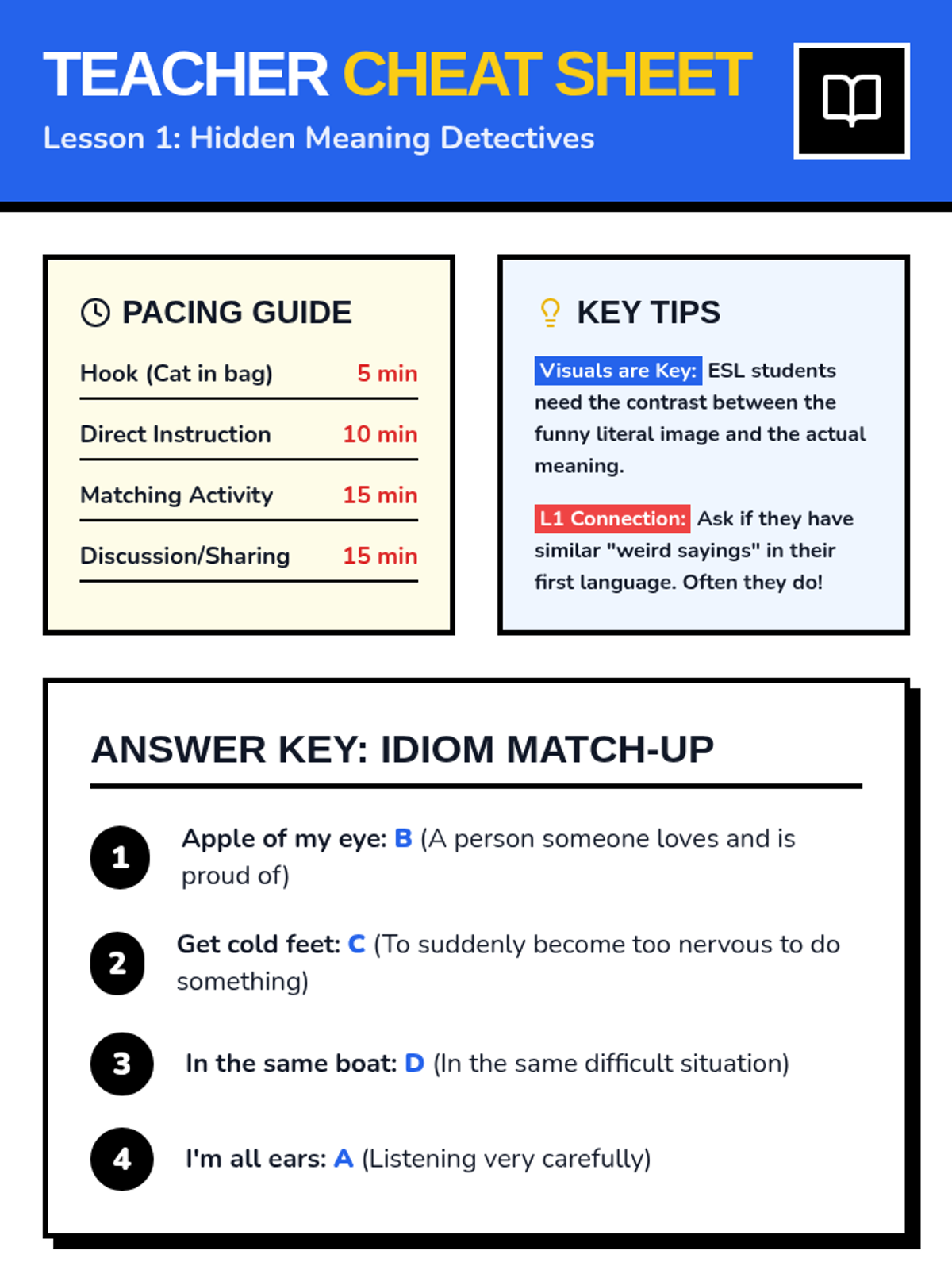 A 5-lesson unit for intermediate ESL students to master English idioms through visualization, categorization, and narrative performance. Students transition from understanding literal vs. figurative meanings to performing original skits that use idioms naturally.