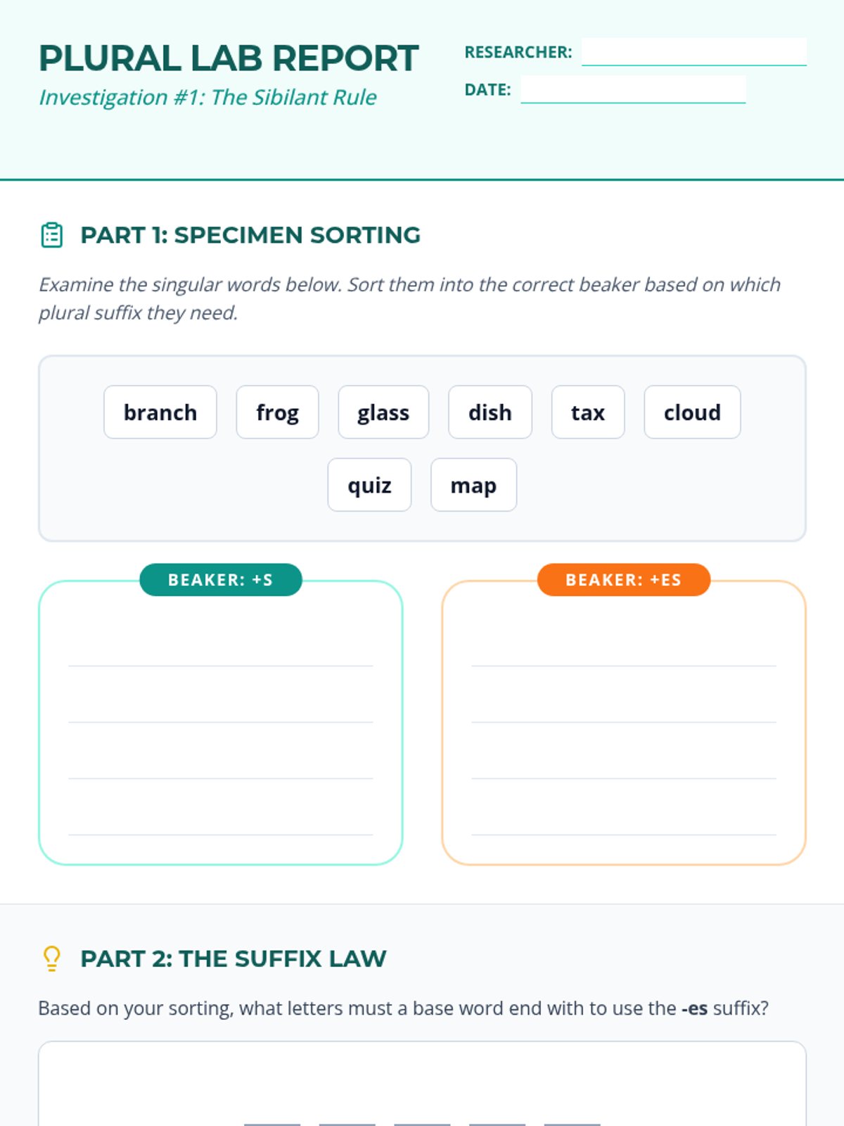 A comprehensive 3rd-grade spelling unit focusing on morphological awareness and suffix rules. Students use an inquiry-based approach to master pluralization, the Silent E Drop rule, the 1-1-1 Doubling rule, and the Y-to-I change, culminating in a systematic flowchart for spelling accuracy.
