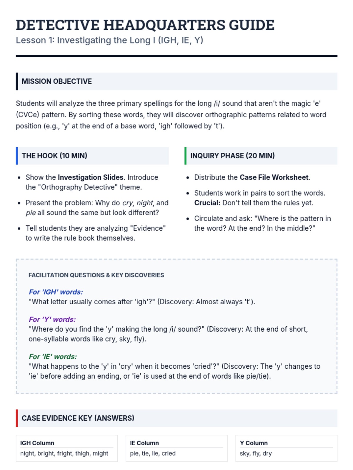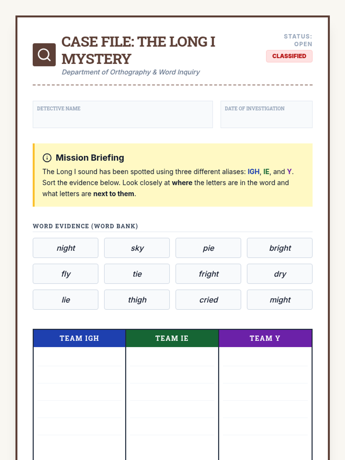 An inquiry-based phonics unit where 3rd-grade students act as 'Orthography Detectives' to investigate complex long vowel patterns, multisyllabic CVCe words, irregular 'oddballs', and the soft sounds of C and G. Students move from basic decoding to structural analysis, culminating in a collaborative classroom rule book.