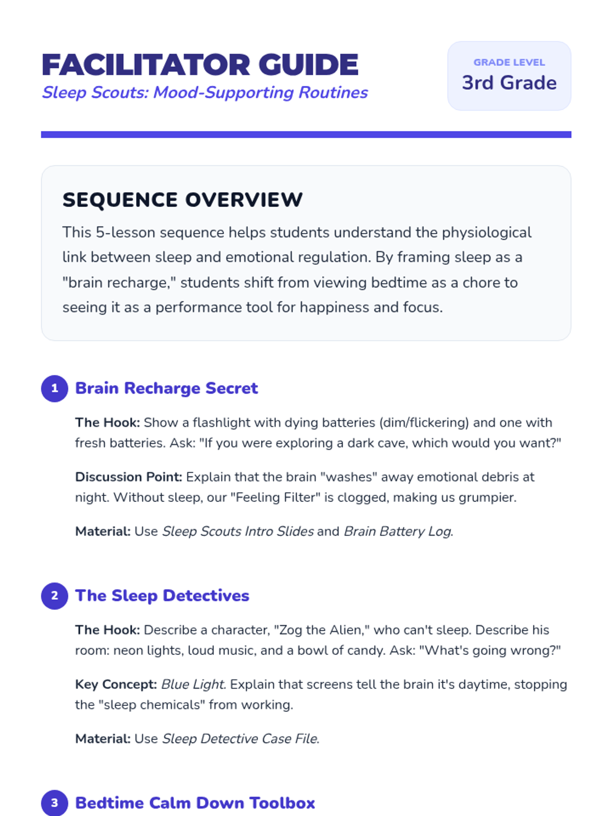 A comprehensive sequence for 3rd graders to understand the science of sleep, its impact on emotional regulation, and how to build restorative evening routines. Students will investigate the sleep-brain connection, identify 'sleep stealers', practice relaxation techniques, and design their own personalized bedtime checklists.