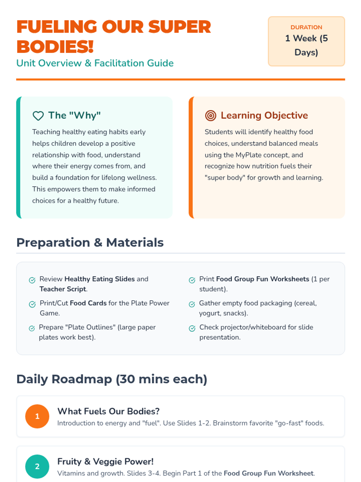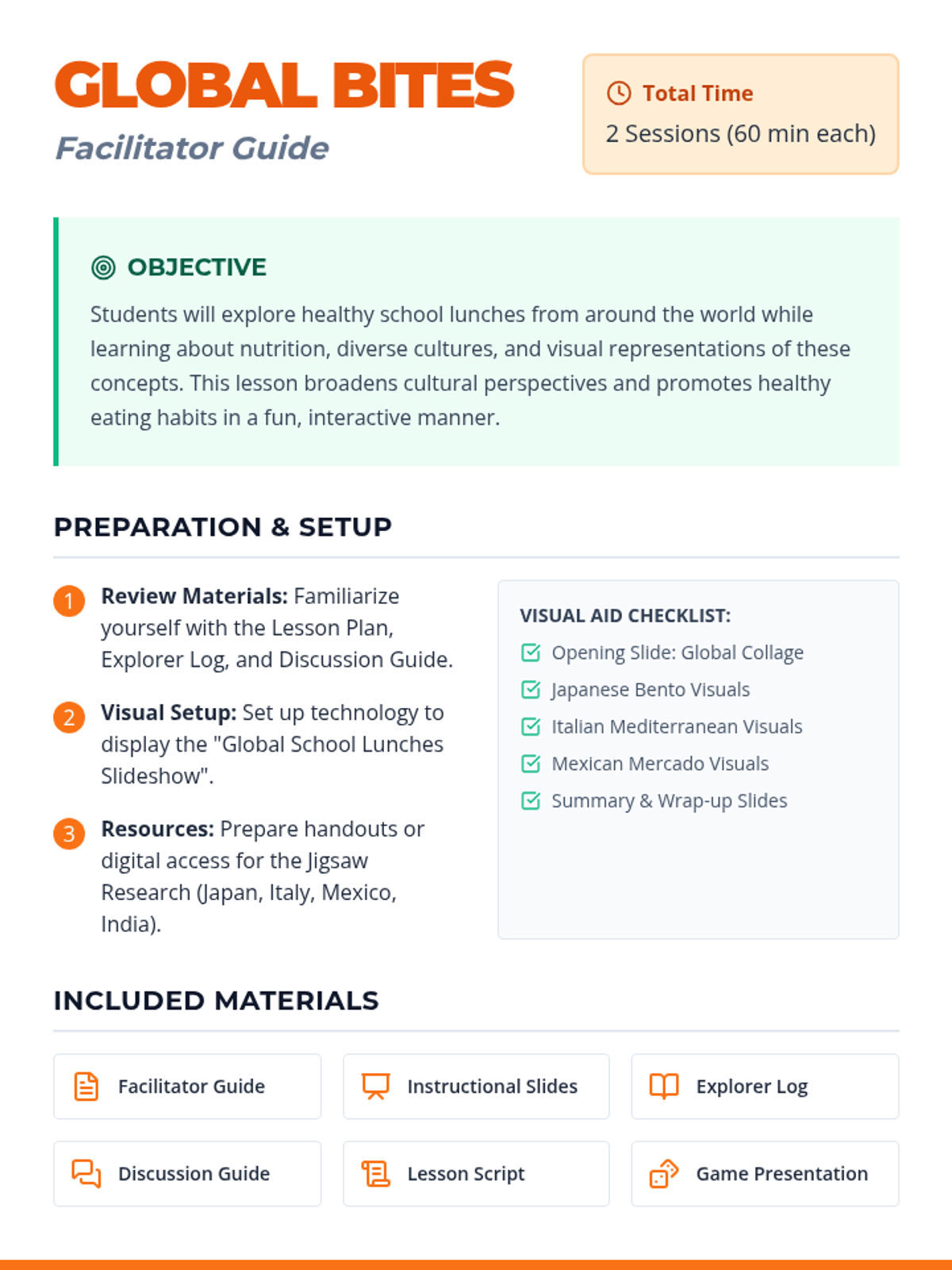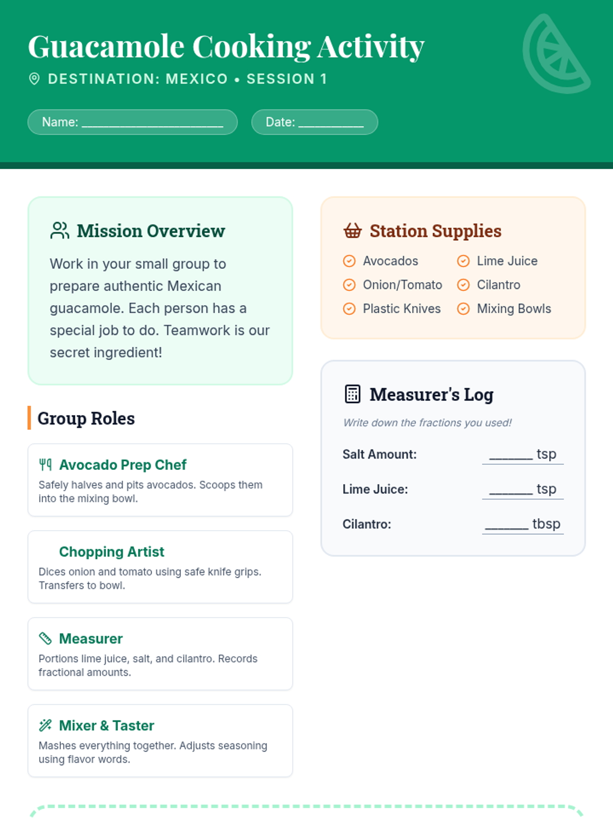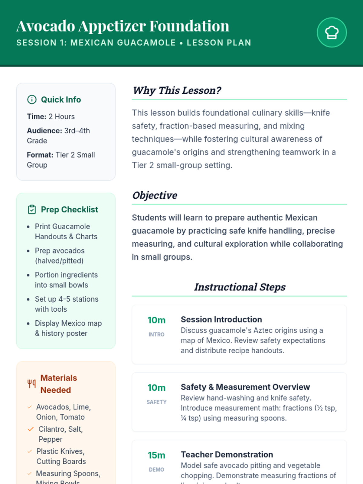 A 6-session culinary journey where 3rd and 4th graders explore flavors from Mexico, Italy, Japan, India, and Morocco while building kitchen skills, cultural awareness, and teamwork. Each session features a detailed lesson plan, a guided activity guide, and recipe handouts designed for Tier 2 small-group instruction.
