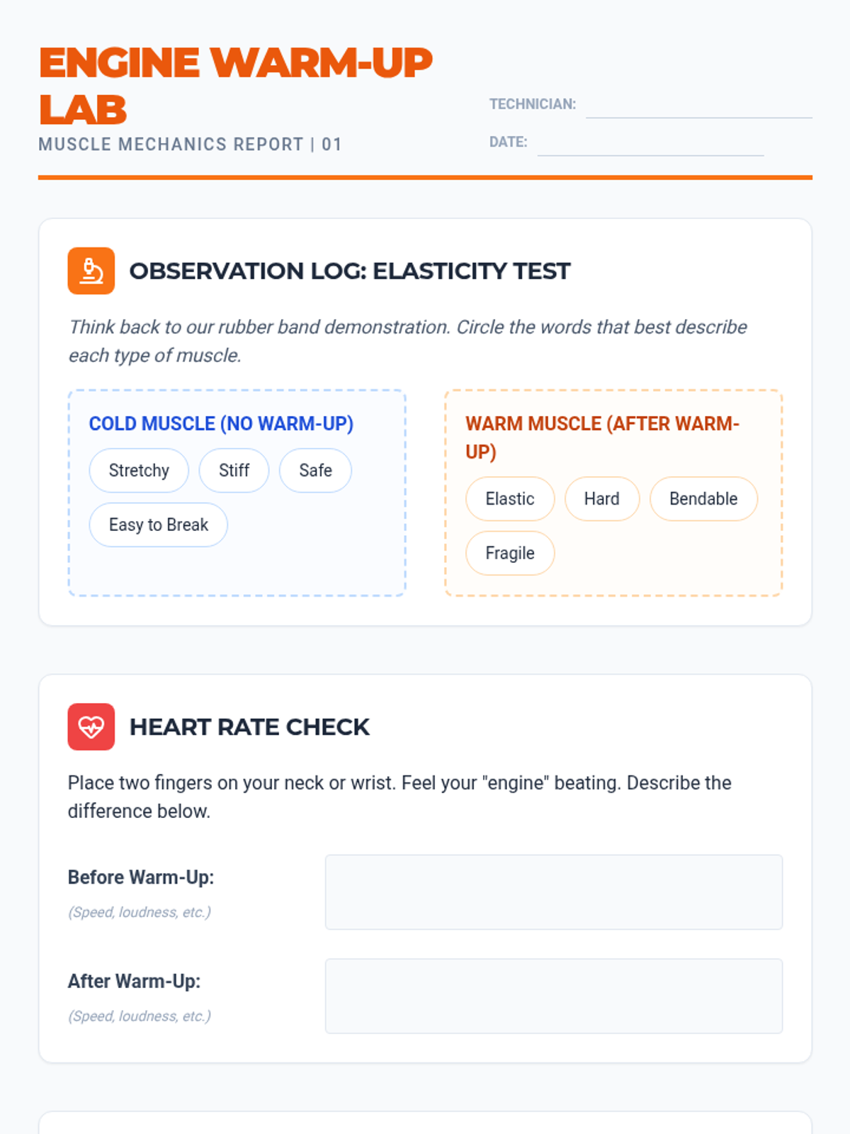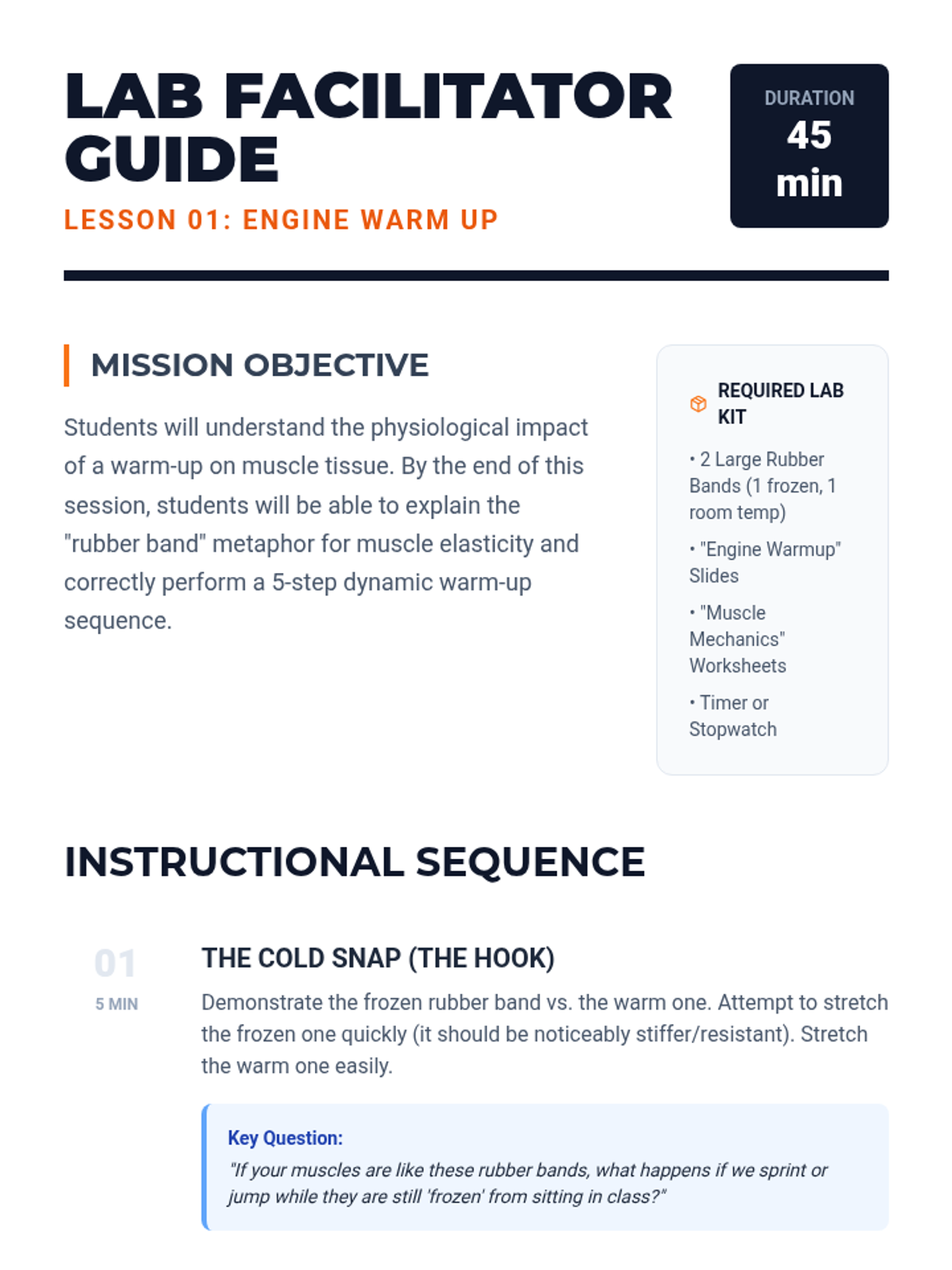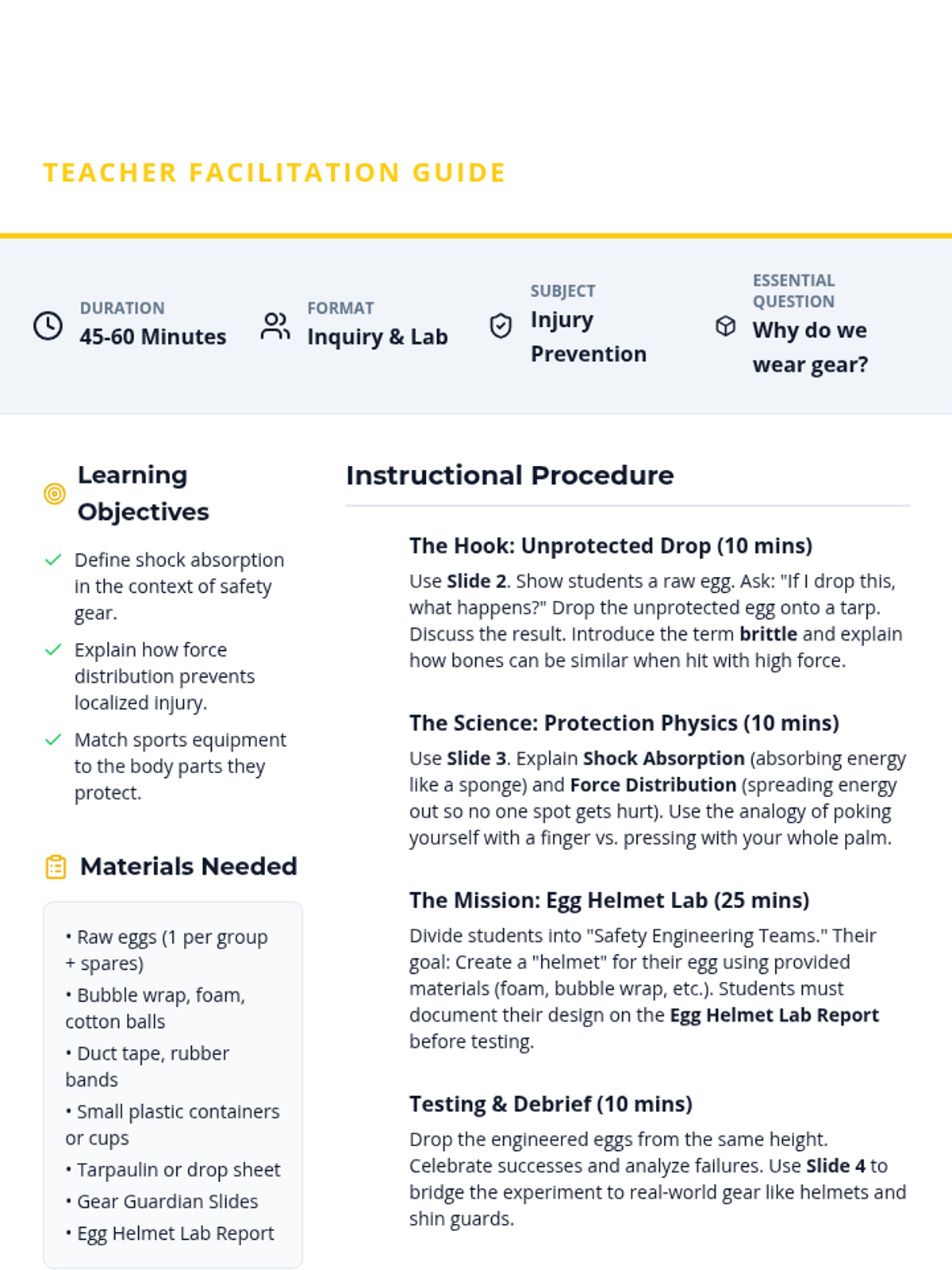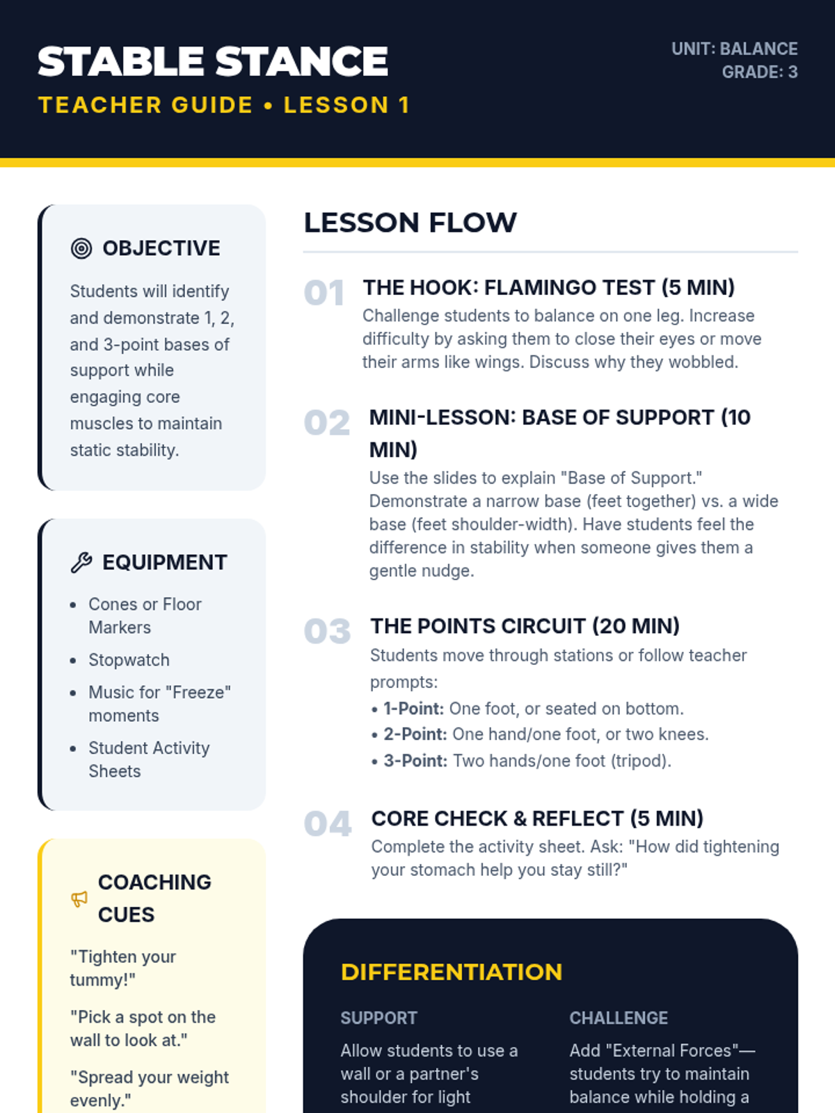 A comprehensive unit for 3rd-grade students focused on the physical mechanics of injury prevention. Students explore physiological preparation, spatial awareness, force absorption, and proper lifting techniques through hands-on simulations and skill-building activities.