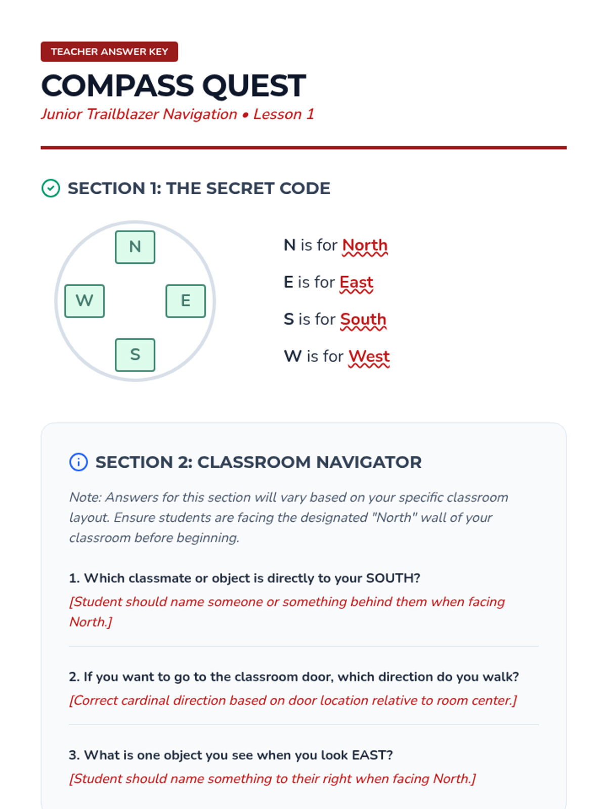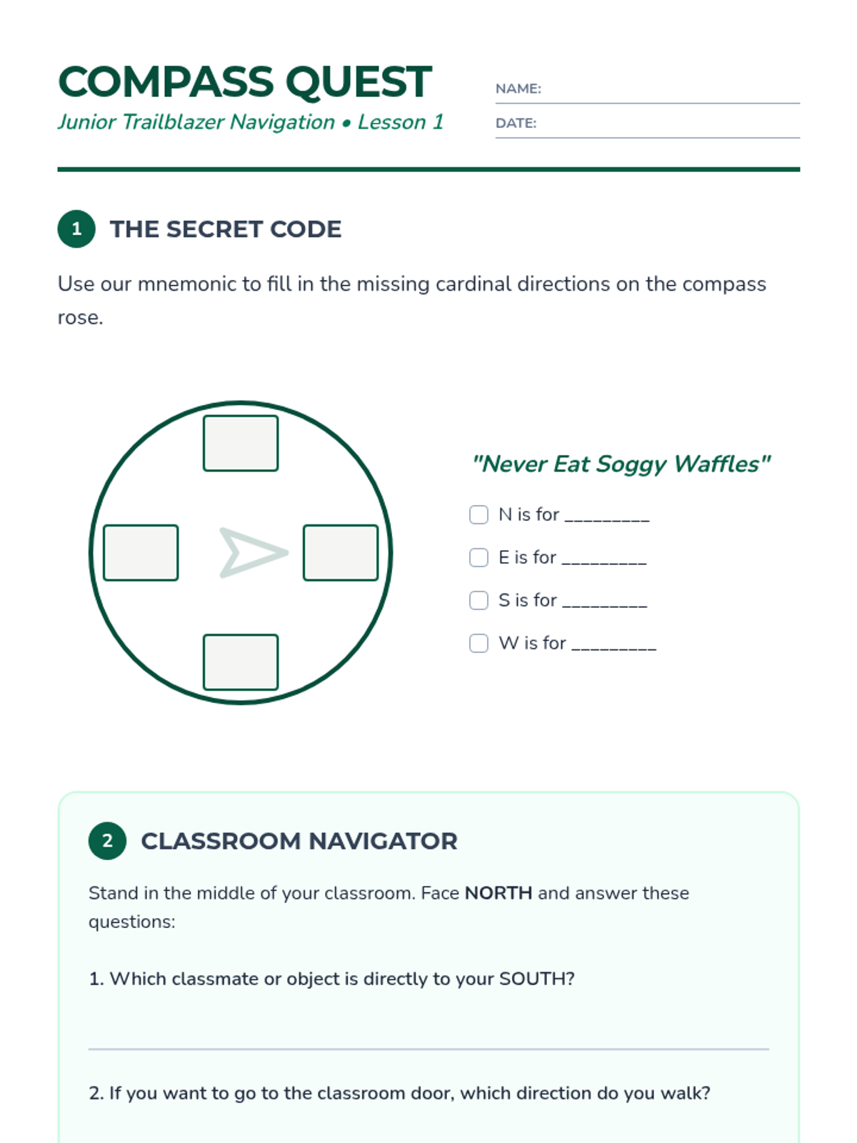 This 5-lesson sequence introduces 3rd-grade students to the fundamental skills of outdoor navigation and safety. Students progress from learning cardinal directions and map symbols to physical skills like pacing and identifying trail markers, culminating in a schoolyard orienteering challenge.