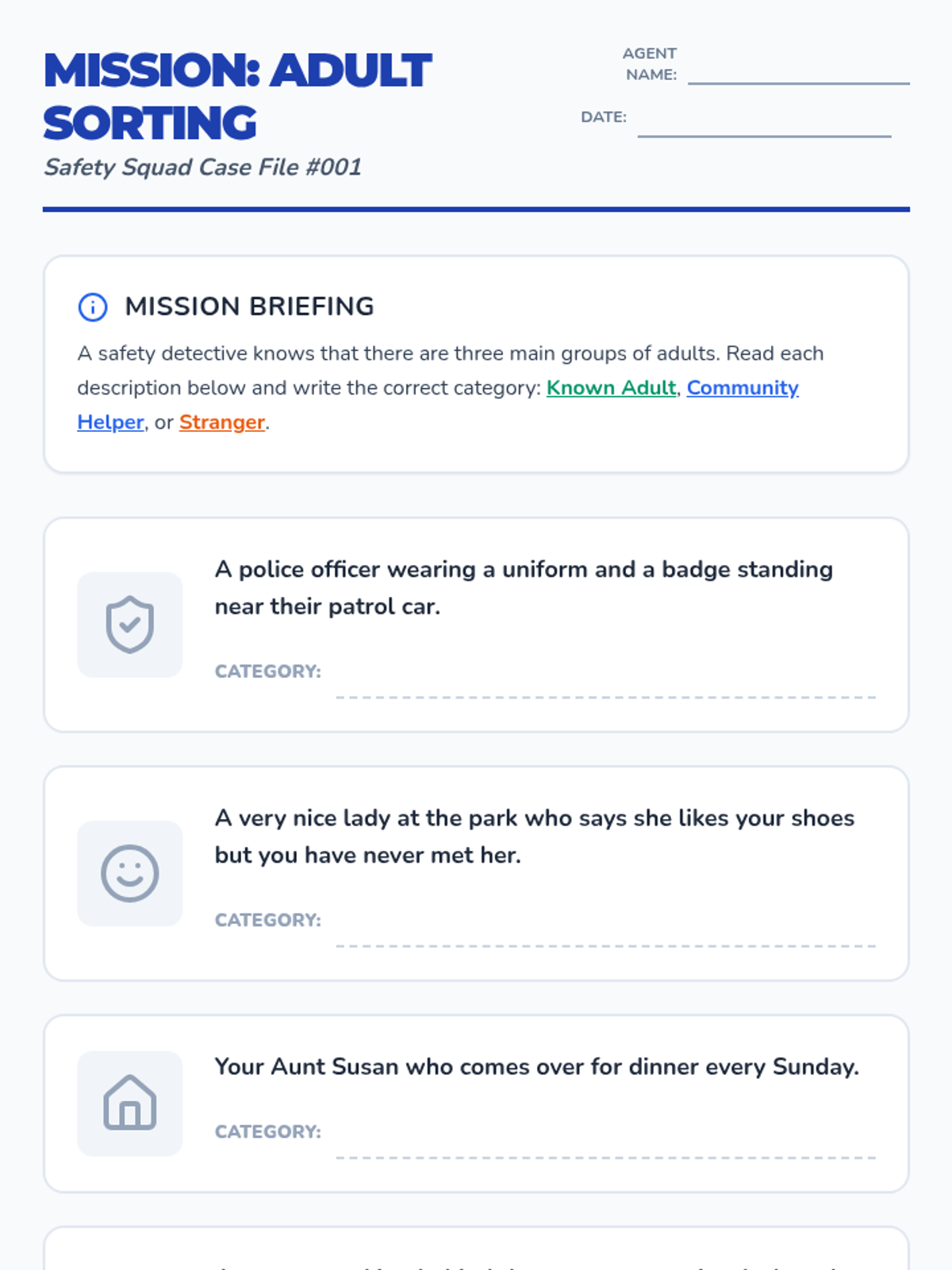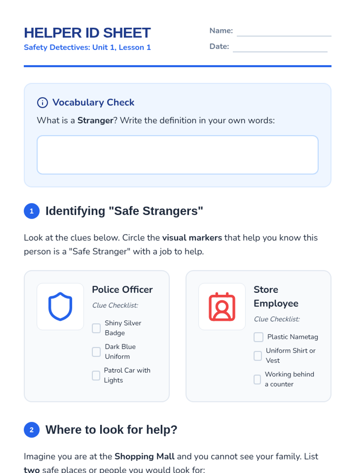 Stranger DangerDistinguishes between safe adults and strangers through situational awareness and boundary setting. Equips students with communication protocols and emergency response actions for public spaces.