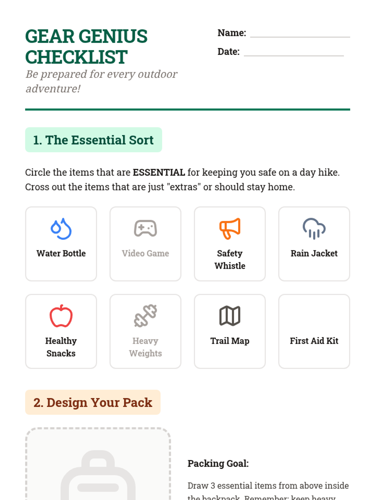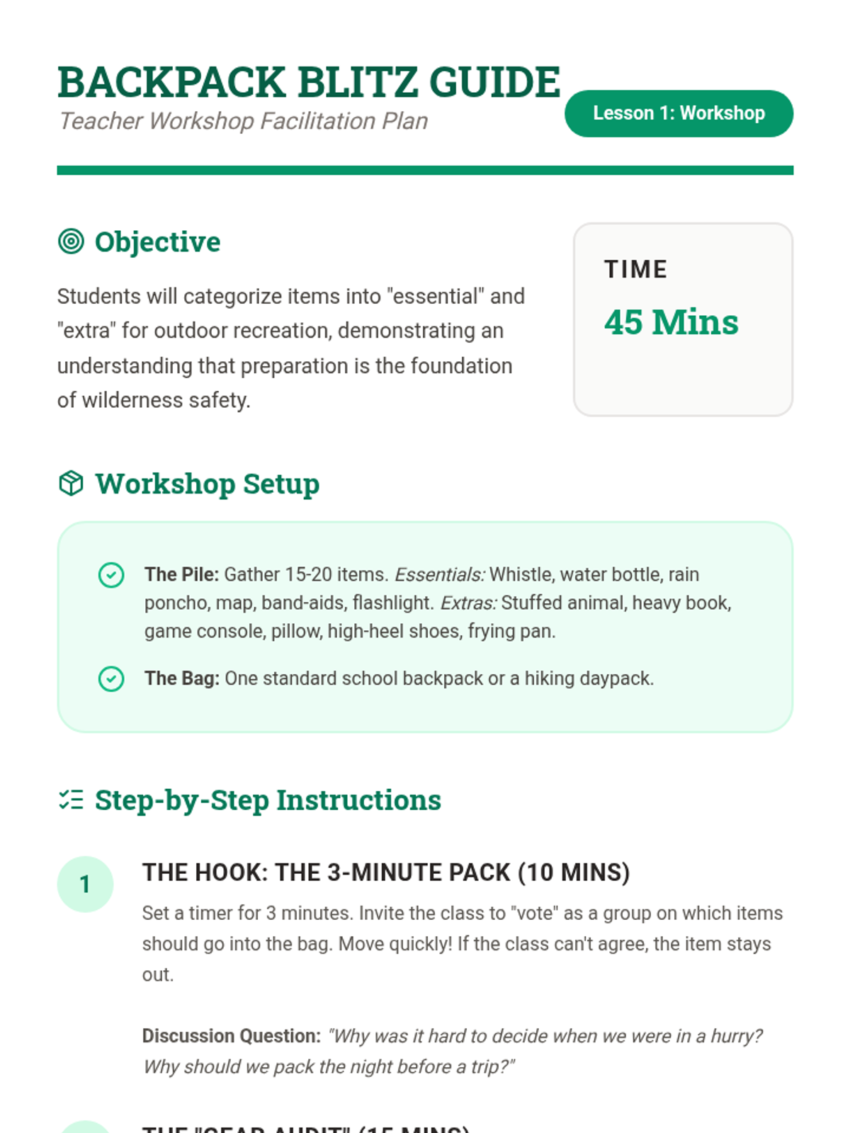 A comprehensive 5-lesson sequence for 3rd graders on outdoor safety, covering essential gear, weather hazards, navigation, risk assessment, and emergency signaling using the S.T.O.P. rule. Students engage in practical workshops and simulations to build confidence in the wilderness.