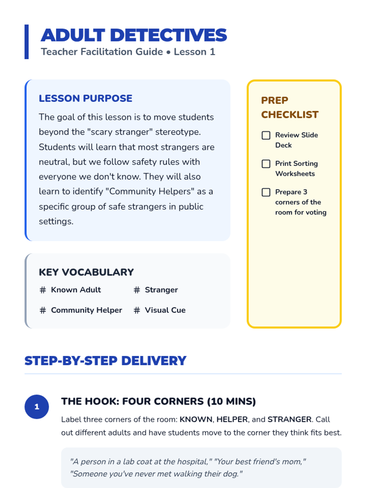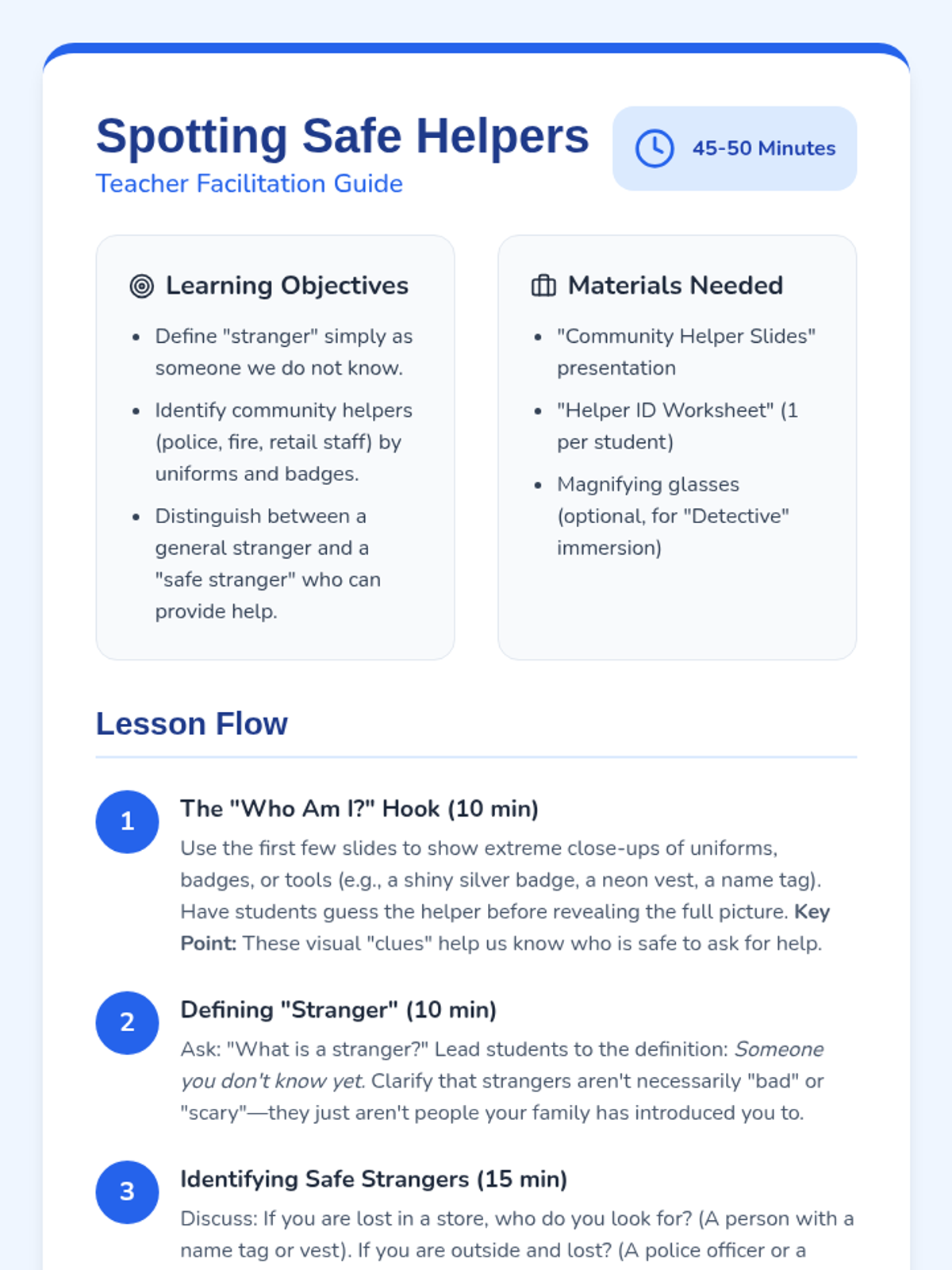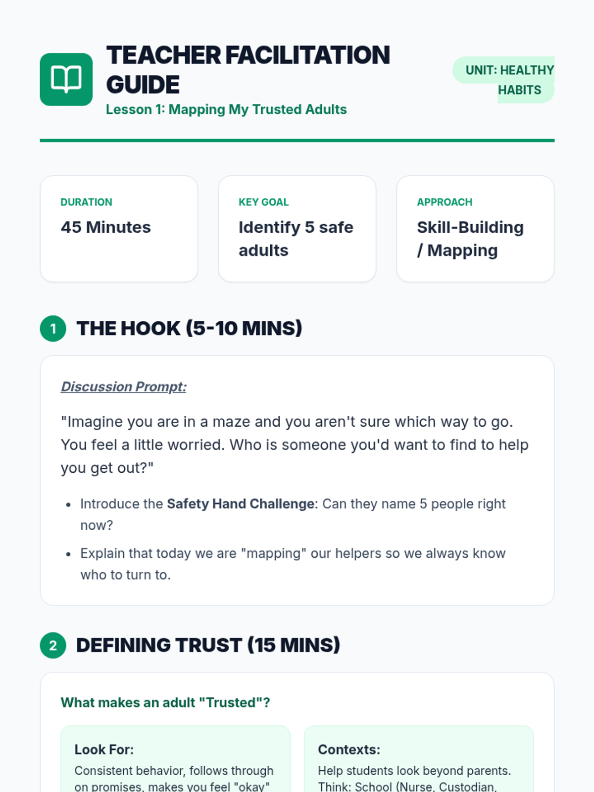 A comprehensive 5-lesson sequence for 3rd graders moving from 'stranger danger' to the 'tricky people' concept. Students learn to identify safe adults, recognize unsafe behaviors, trust their instincts, and distinguish between safe surprises and unsafe secrets.