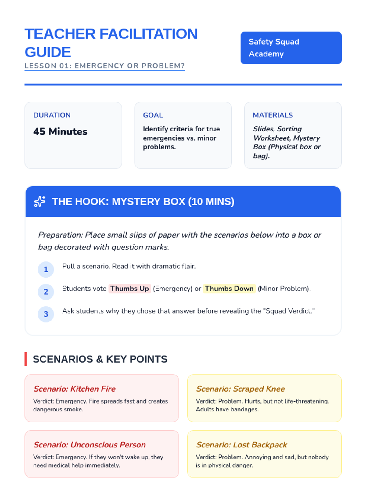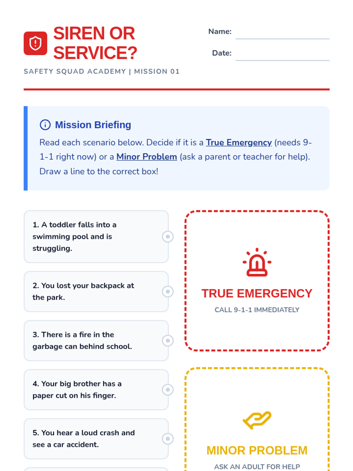 A comprehensive 3rd-grade sequence focused on distinguishing emergencies from minor problems, mastering 9-1-1 communication, and practicing fire safety and basic first aid protocols. Students progress from situational analysis to active physical simulations.