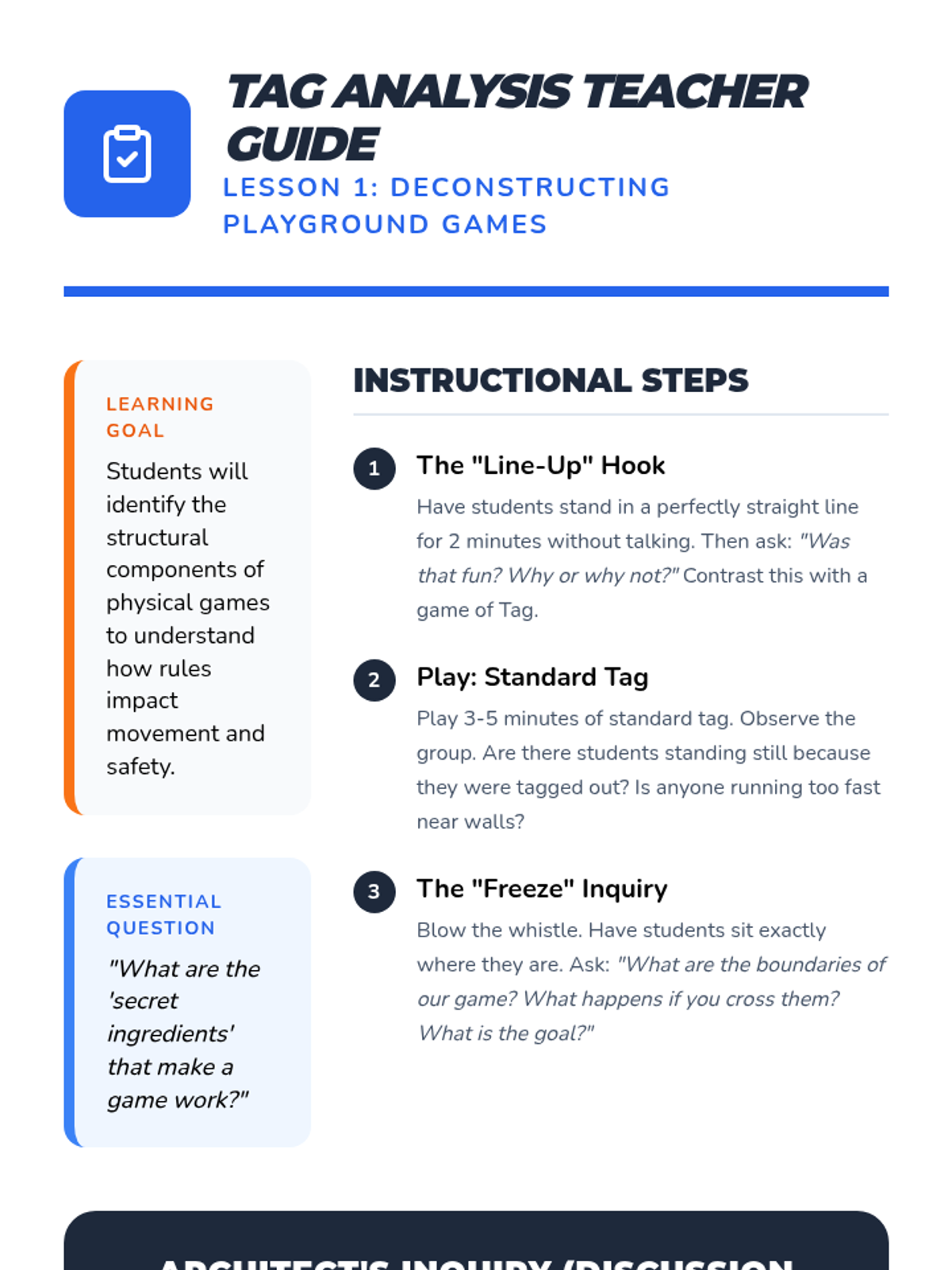 A project-based sequence for 3rd graders to analyze, design, and lead their own cooperative physical activities. Students move from deconstructing classic games to inventing new ones that maximize movement, safety, and inclusivity.