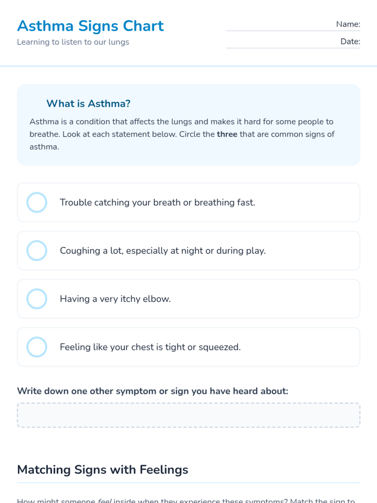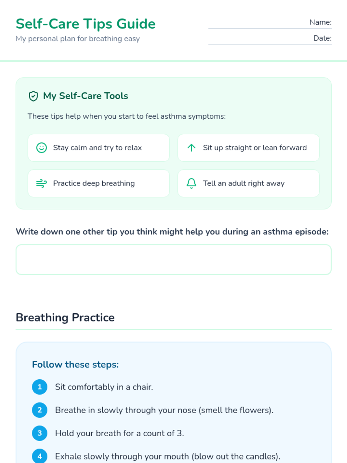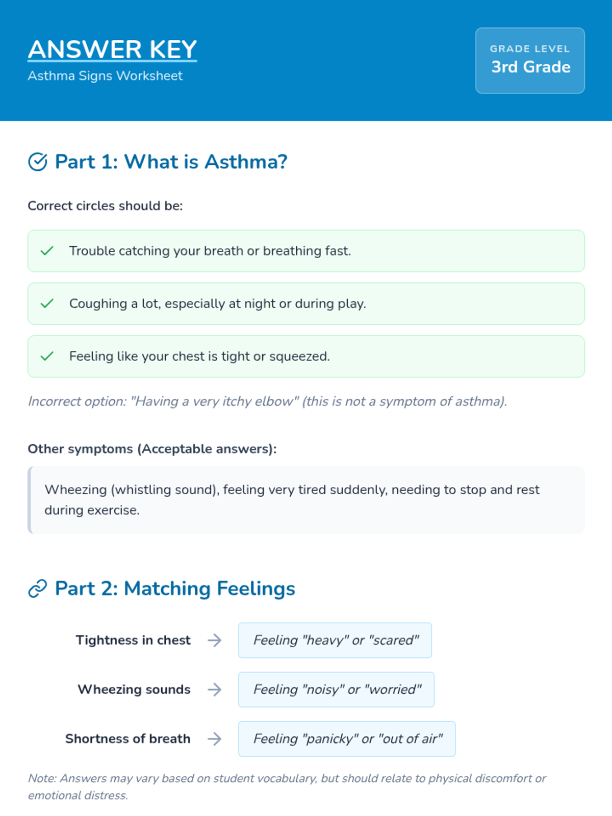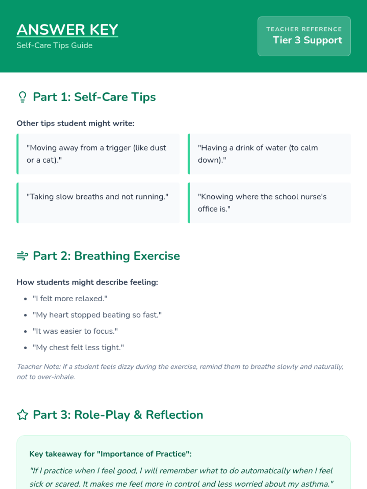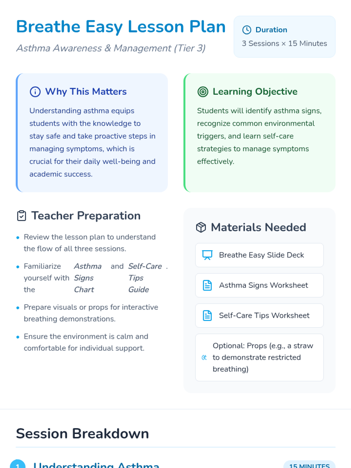 A 3-session intervention sequence for 3rd graders focused on understanding asthma, identifying triggers, and practicing self-care management strategies.