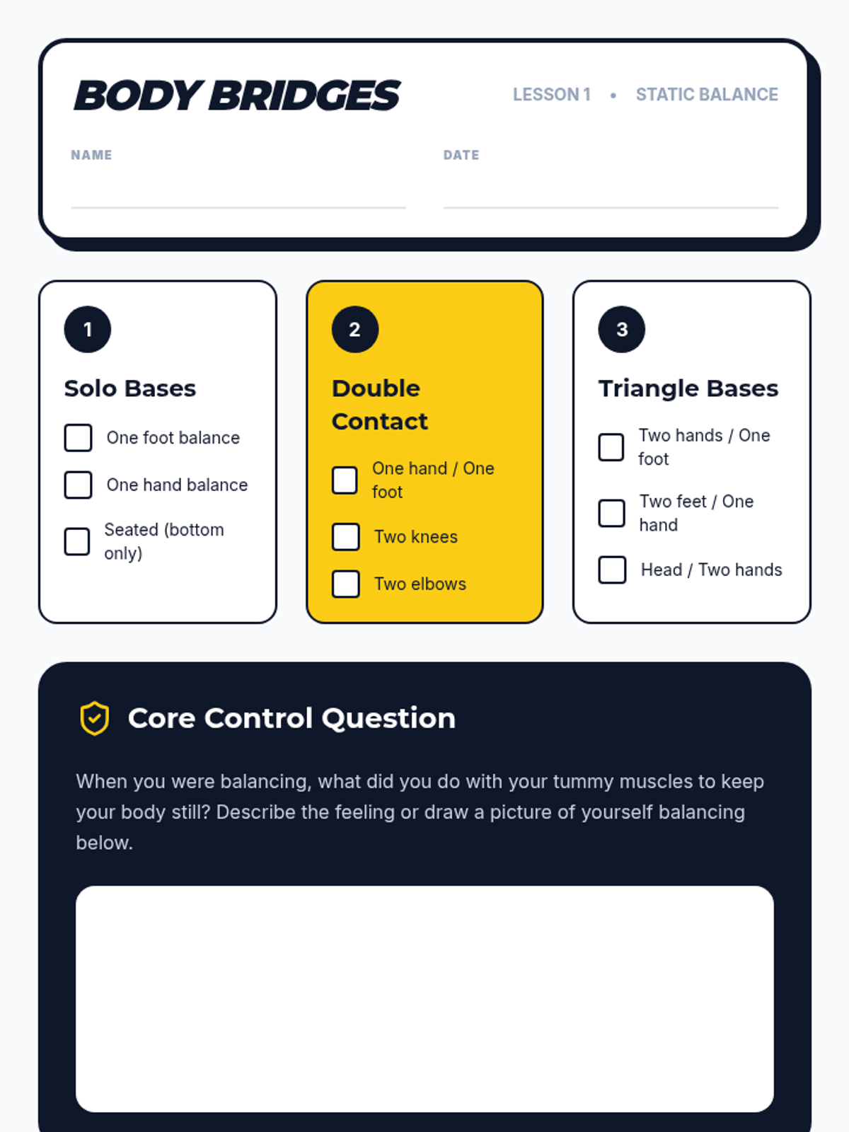 A physical progression for 3rd-grade students to master body control, moving from static stability to dynamic movement across various pathways and levels, culminating in a complex obstacle course challenge.