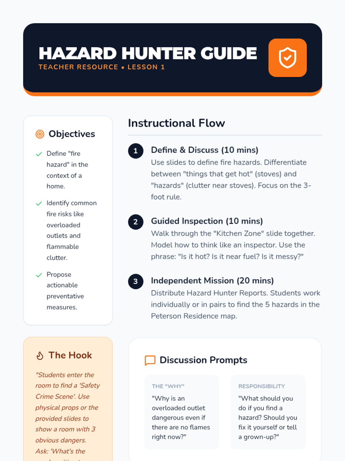 This 5-lesson sequence for 3rd graders covers residential fire hazards, escape planning, emergency techniques like Stop-Drop-and-Roll, and comprehensive water safety protocols including 'Reach, Throw, Don't Go'. Students learn through simulations, hazard mapping, and procedural practice.