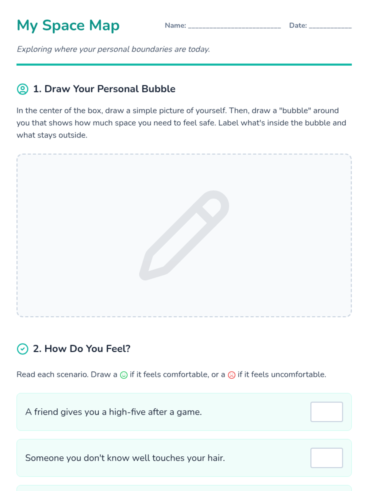 Personal BoundariesIdentification of personal space, consent, and verbal boundary-setting strategies. Equips students to communicate comfort levels and recognize appropriate physical interactions in social contexts.