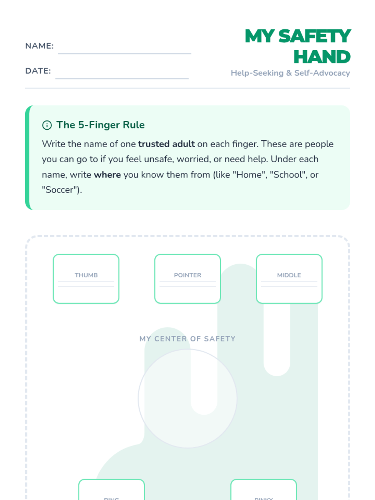 This five-lesson sequence empowers third-grade students to build personal safety networks and develop the communication skills needed for self-advocacy. Students move from identifying trusted adults to distinguishing between tattling and reporting, practicing assertive communication, setting physical and emotional boundaries, and finally applying these skills through scenario-based role-plays.