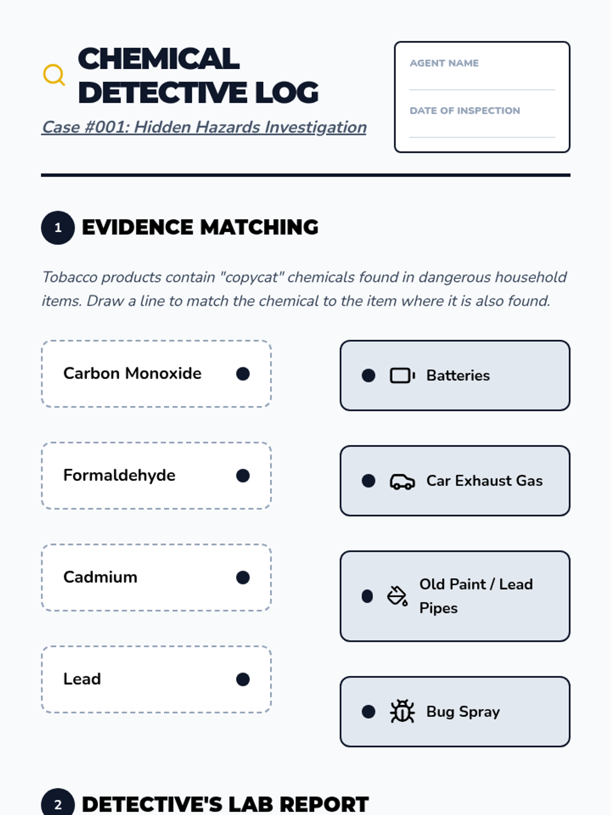 A 3rd-grade health sequence that uses a 'Chemical Detective' theme to demystify tobacco and vaping products. Students investigate toxic ingredients, understand the concept of addiction through games, and learn to categorize substances as food or poison to reinforce healthy choices.