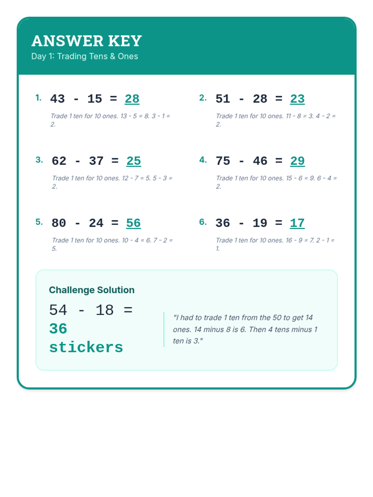 Subtract & Regroup Day 1 Answer Key
