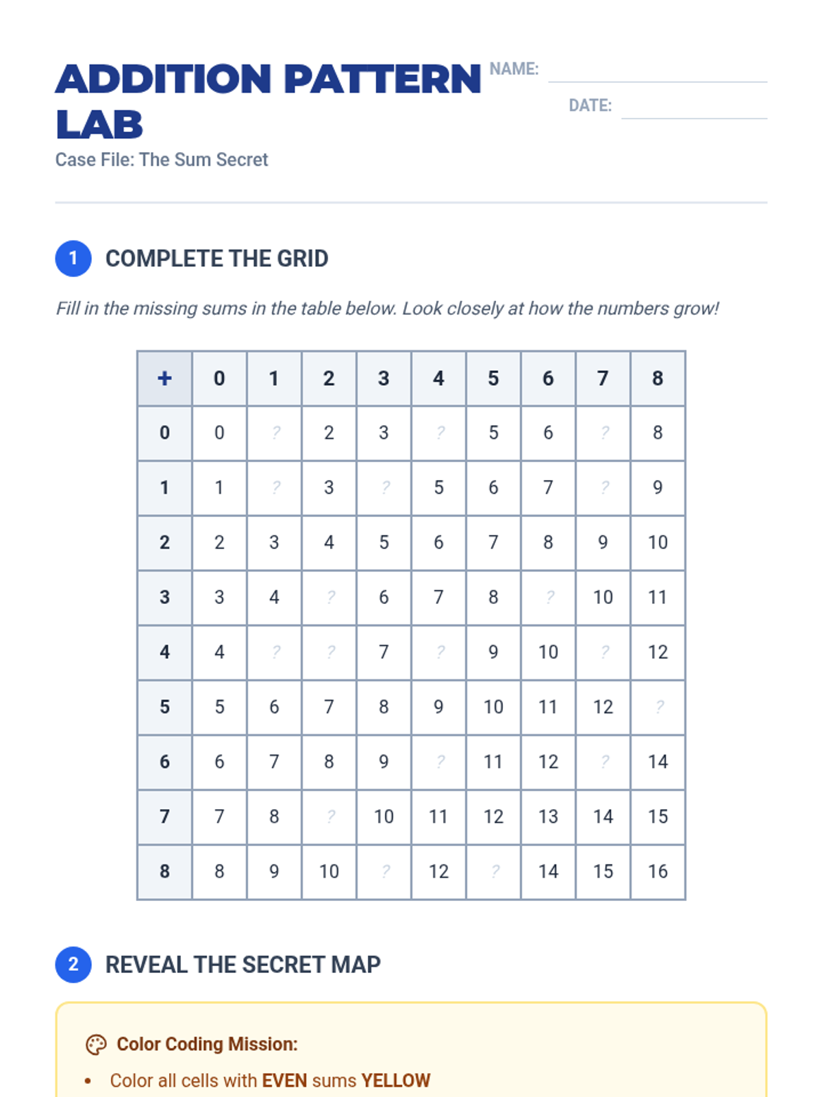 Addition Pattern Lab Worksheet