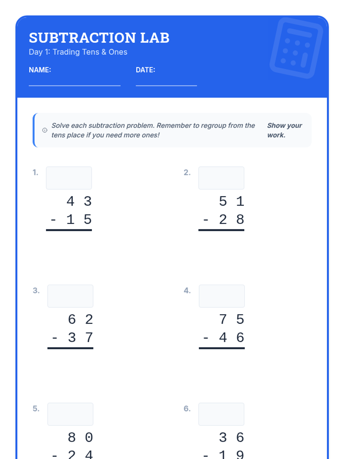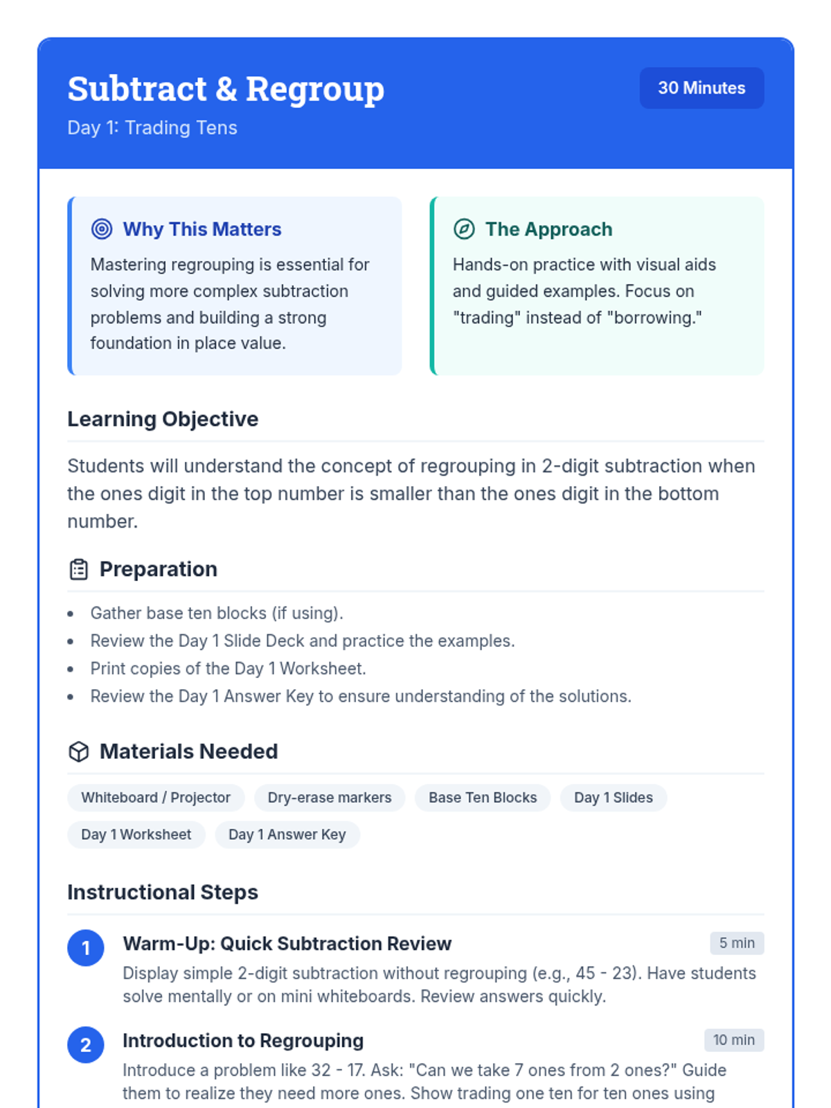 Subtract & Regroup Day 1 Lesson Plan