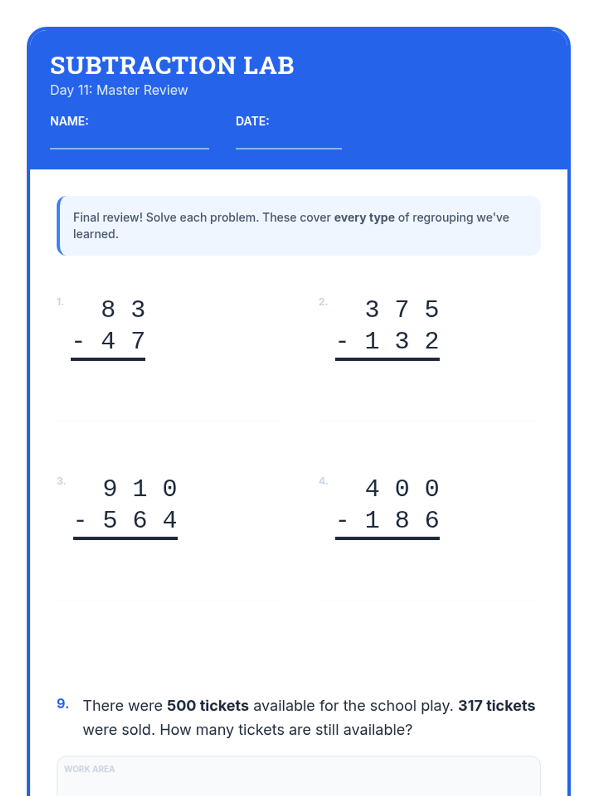 Subtract & Regroup Day 11 Worksheet