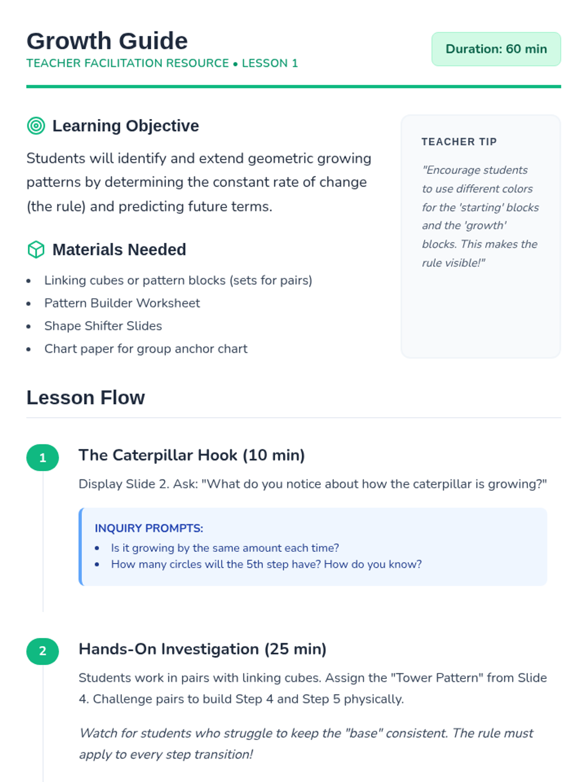 This inquiry-based sequence focuses on algebraic thinking by exploring numerical patterns and functional relationships. Students progress from simple repeating and growing patterns to identifying explicit rules and using them to predict future terms.