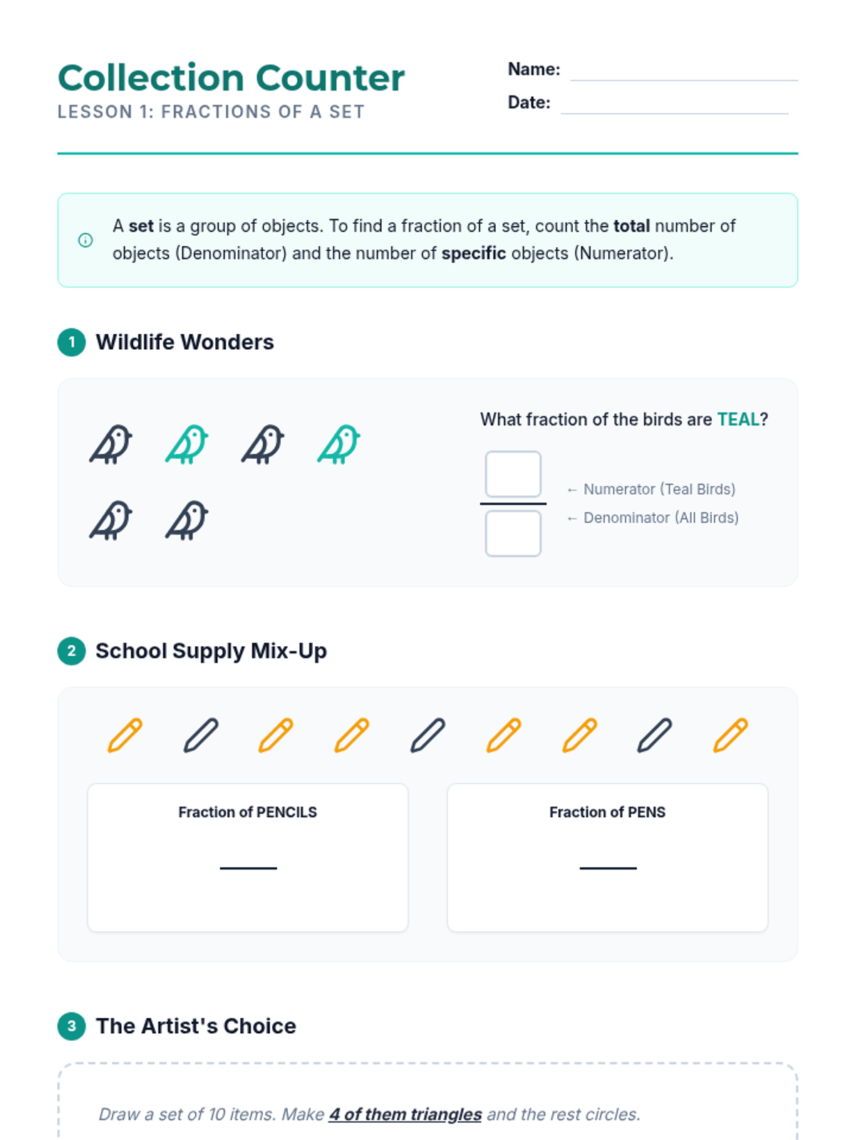 A 3rd-grade sequence exploring fractions through discrete sets of objects and real-world data, culminating in a creative design project. Students move beyond area models to understand fractions as parts of a group, connecting division and categorization to fractional notation.