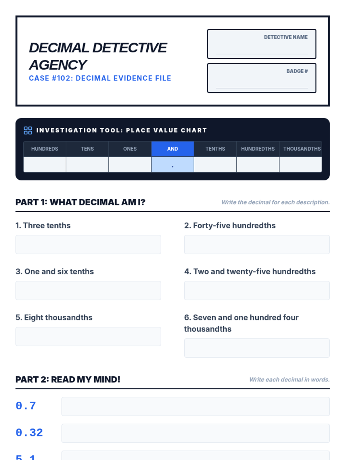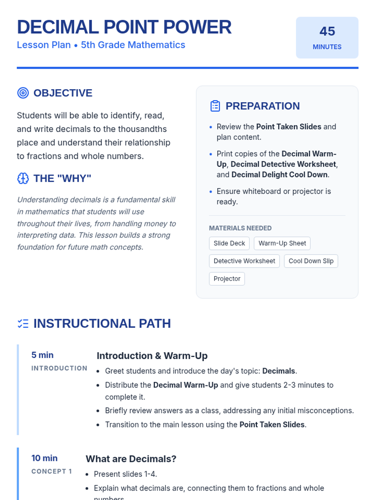 A dual-session sequence covering 5th-grade decimal place value and 3rd-grade personal values exploration, designed to build both mathematical precision and character.
