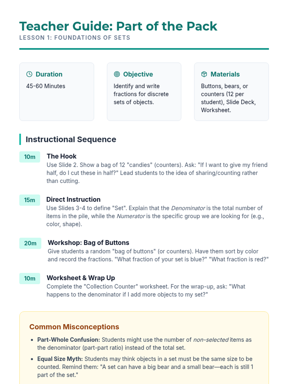 A comprehensive 7-lesson intervention sequence designed to build conceptual fraction understanding through visual models, number lines, and scaffolded practice. The sequence moves from basic area models to adding and subtracting with unlike denominators, prioritizing 'why' over 'how'.