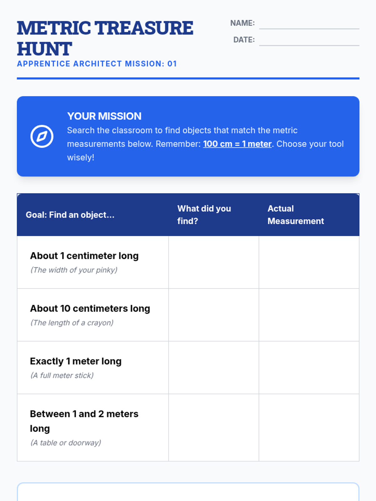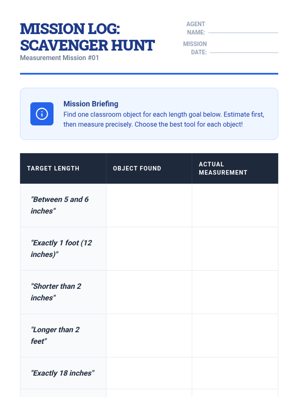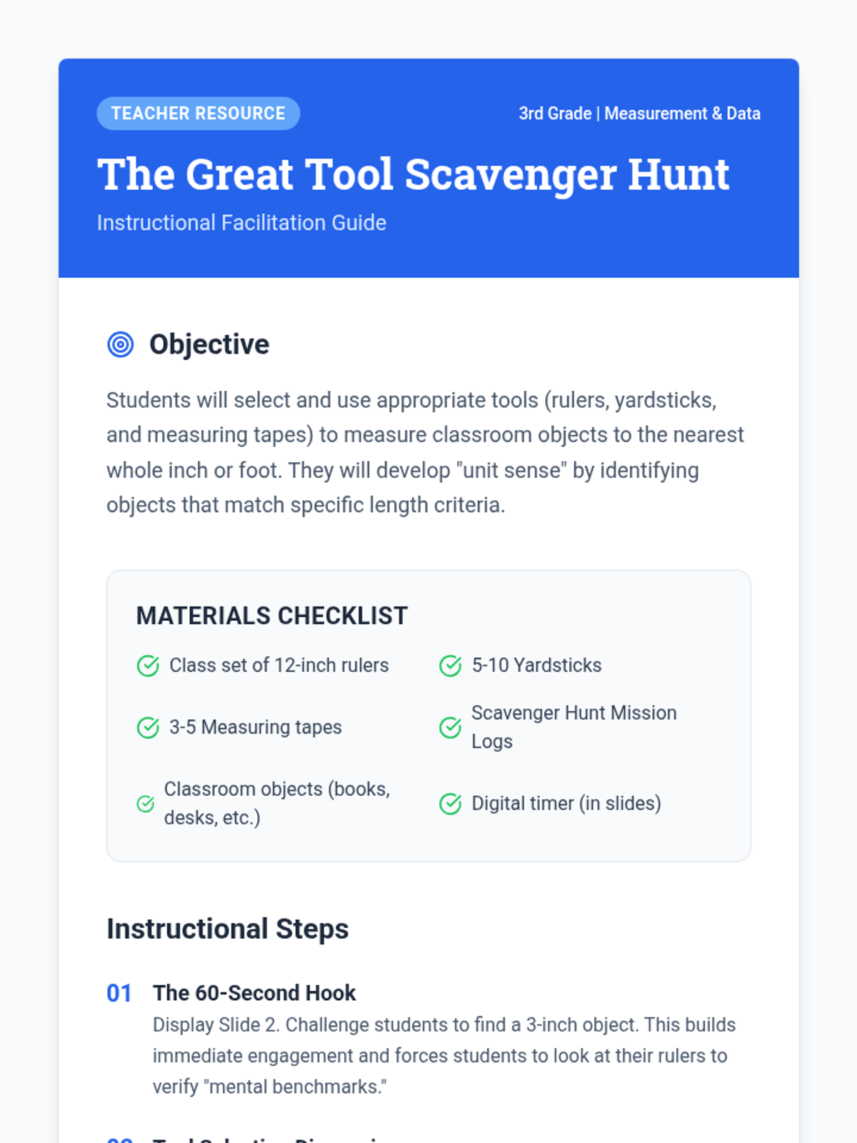 A game-based 3rd grade sequence where students master measurement through active scavenger hunts, error analysis simulations, and a classroom 'Measurement Olympics' to compare and analyze lengths.