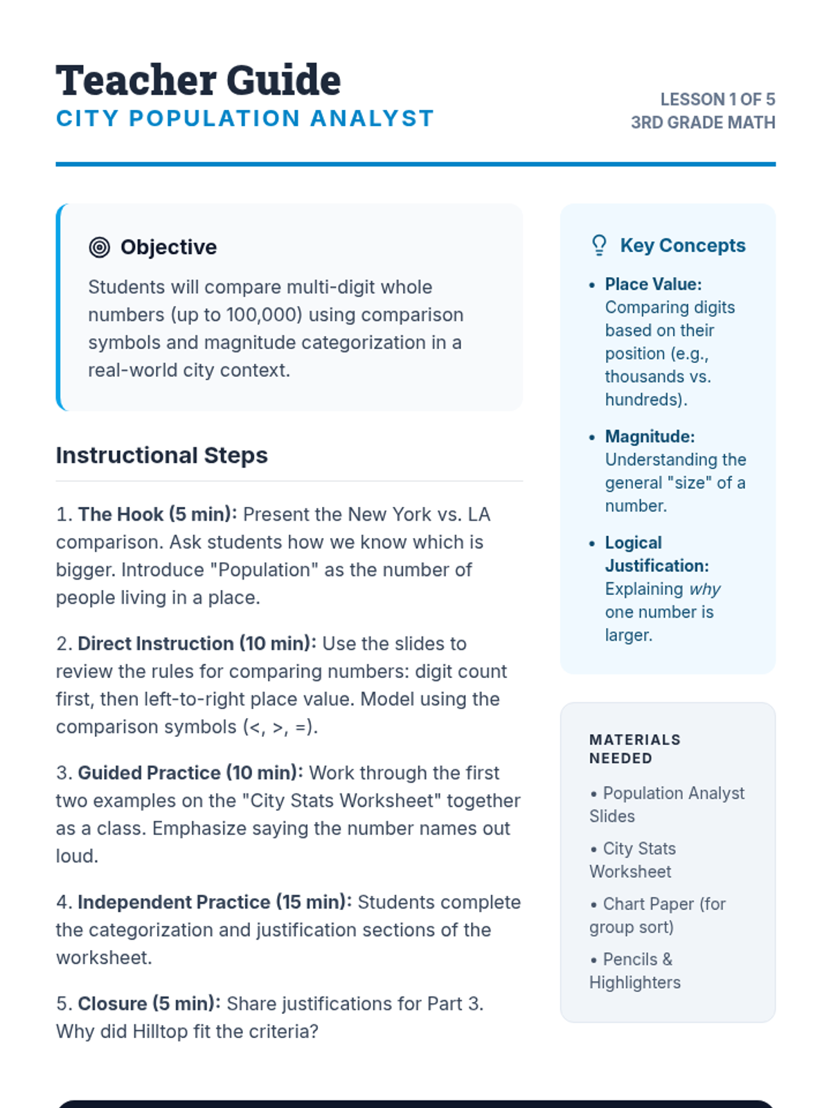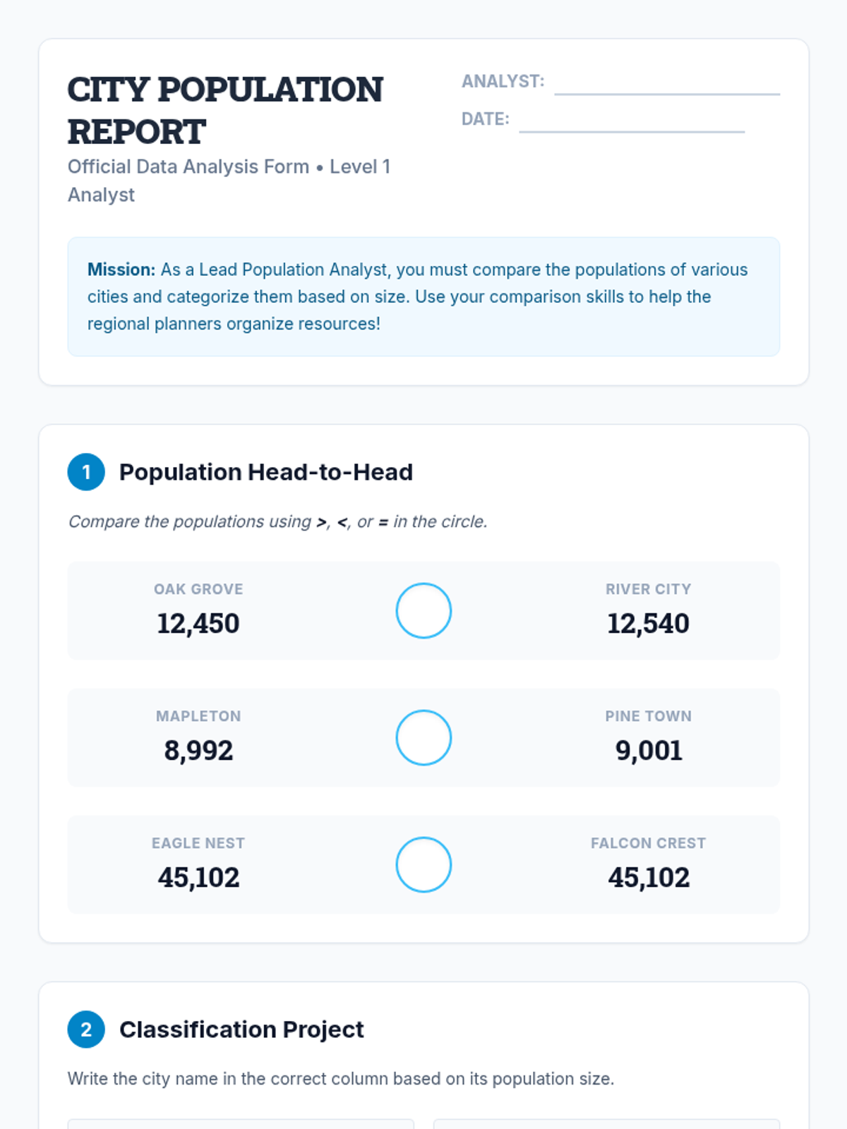 Students act as data analysts to compare populations, prices, distances, and animal statistics. This sequence bridges the gap between abstract number comparison and real-world decision-making using 3rd-grade math standards.