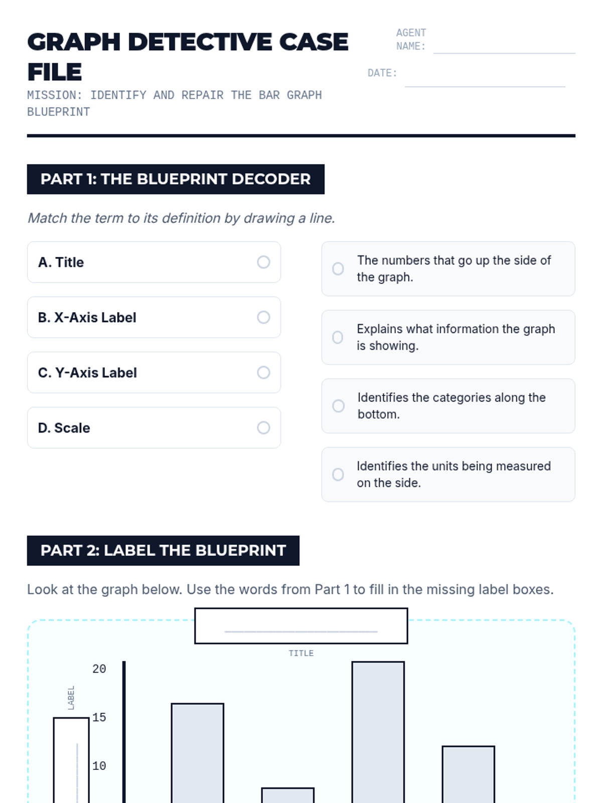 A comprehensive 3rd-grade unit focused on constructing scaled bar graphs and using data to solve one- and two-step comparison problems. Students progress from identifying graph components to mastering complex data analysis.