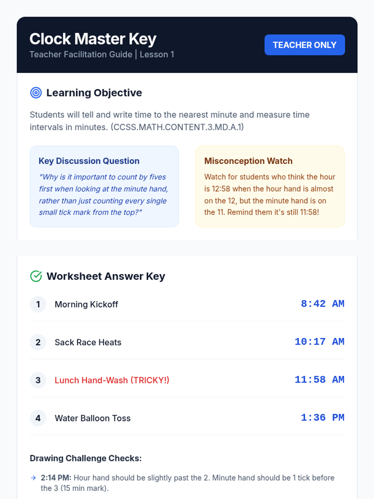 A comprehensive 3rd-grade math unit focusing on reading analog clocks to the minute, calculating elapsed time using number lines, and solving complex time-based word problems. Students progress from basic clock reading to designing their own optimized daily schedules.