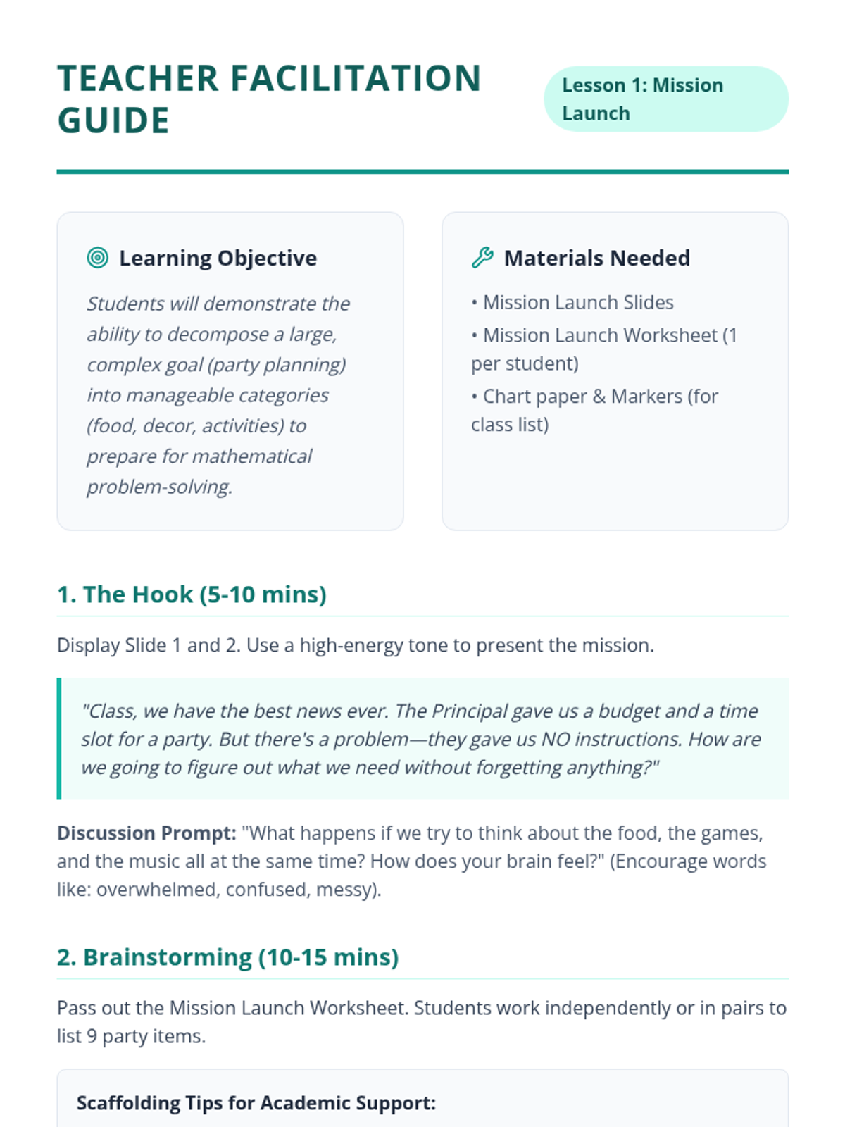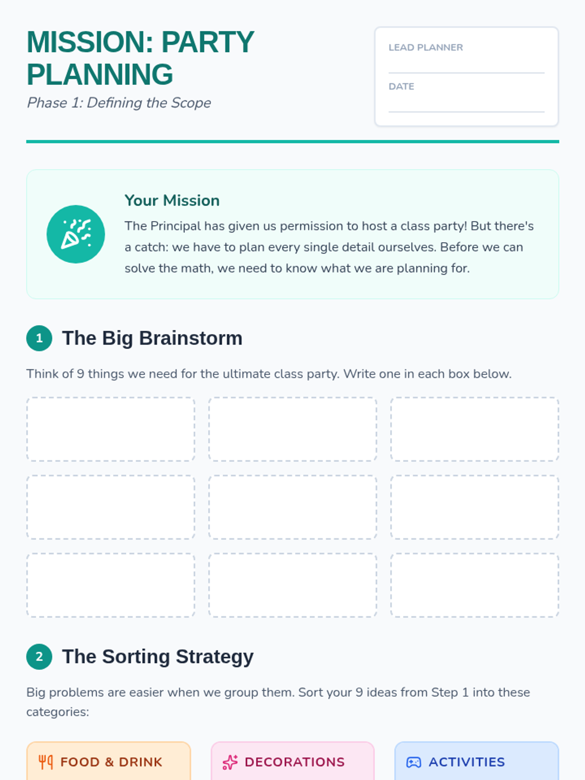 A project-based learning sequence where 3rd-grade students act as event planners to host a class party. Students learn to break down complex, multi-step math problems into manageable tasks involving budgeting, quantities, arrays, and elapsed time.