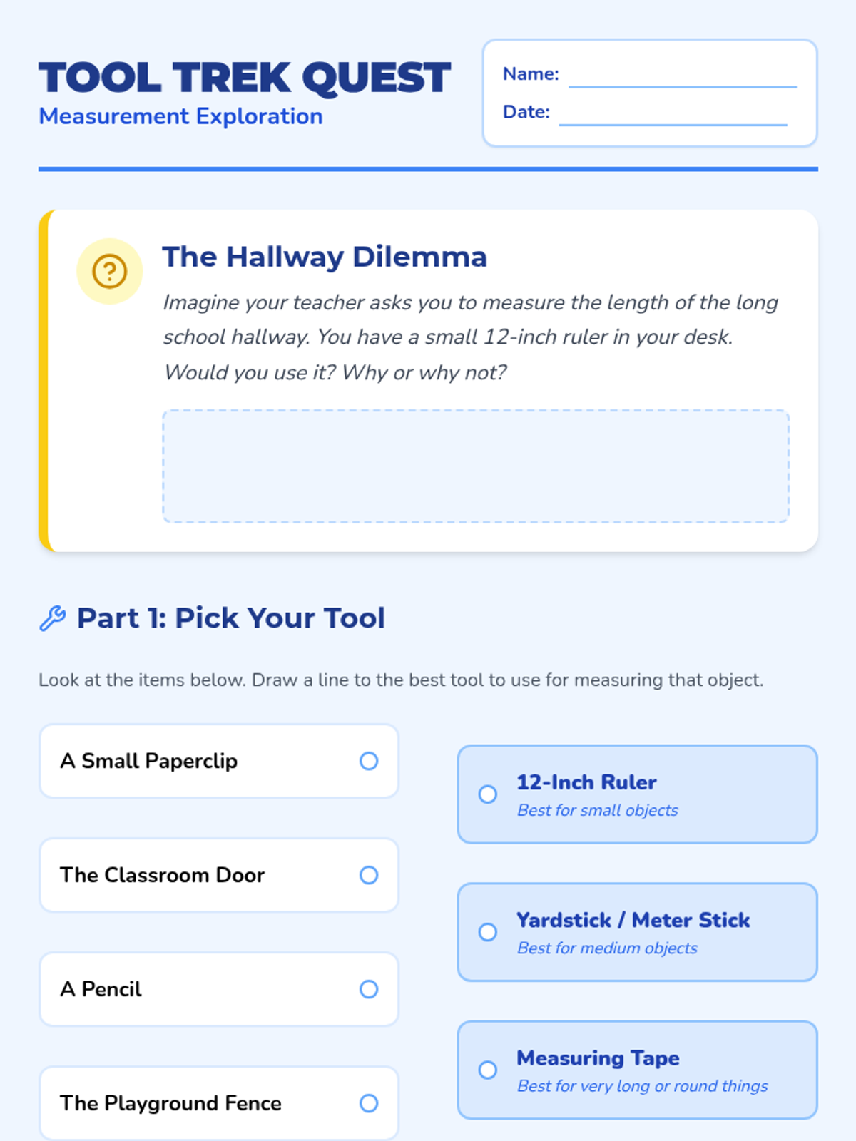 A comprehensive unit for 3rd graders on linear measurement using customary and metric systems. Students master tool selection, develop estimation benchmarks, and practice precision measuring to fractions of an inch and centimeter.